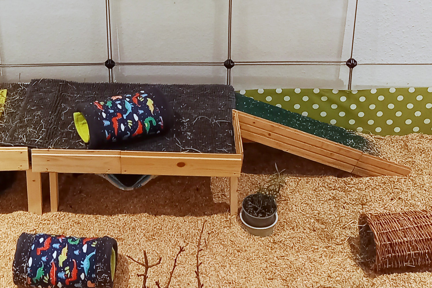 Die Entscheidung für oder gegen eine Etage ist meistens schon bei der Planung des Geheges gefallen. Kleine Etagen können aber auch Teil der Einrichtung ohne Platzverlust sein. Ein Holzbrett auf vier Füßen ist ein toller Unterschlupf, dessen Oberfläche gleichzeitig als Ebene genutzt werden kann. Bei der üblichen Höhe von 15cm bis 22cm können junge Meerschweinchen ohne Probleme dort hinaufgelangen. Dennoch sind ein oder zwei niedrige Rampen mit einer rutschfesten Oberfläche immer sinnvoll. Auch der Untergrund der Ebene sollte rutschfest ausgelegt sein (zB mit einer Decke), damit sie von Meerschweinchen auch genutzt wird.