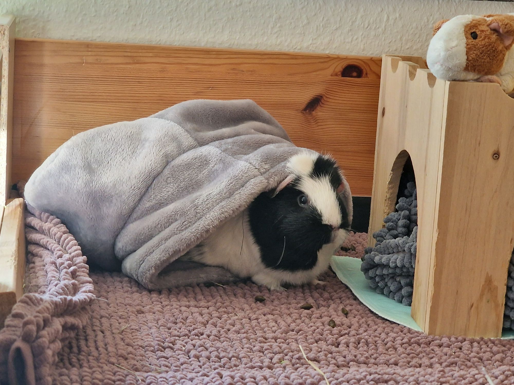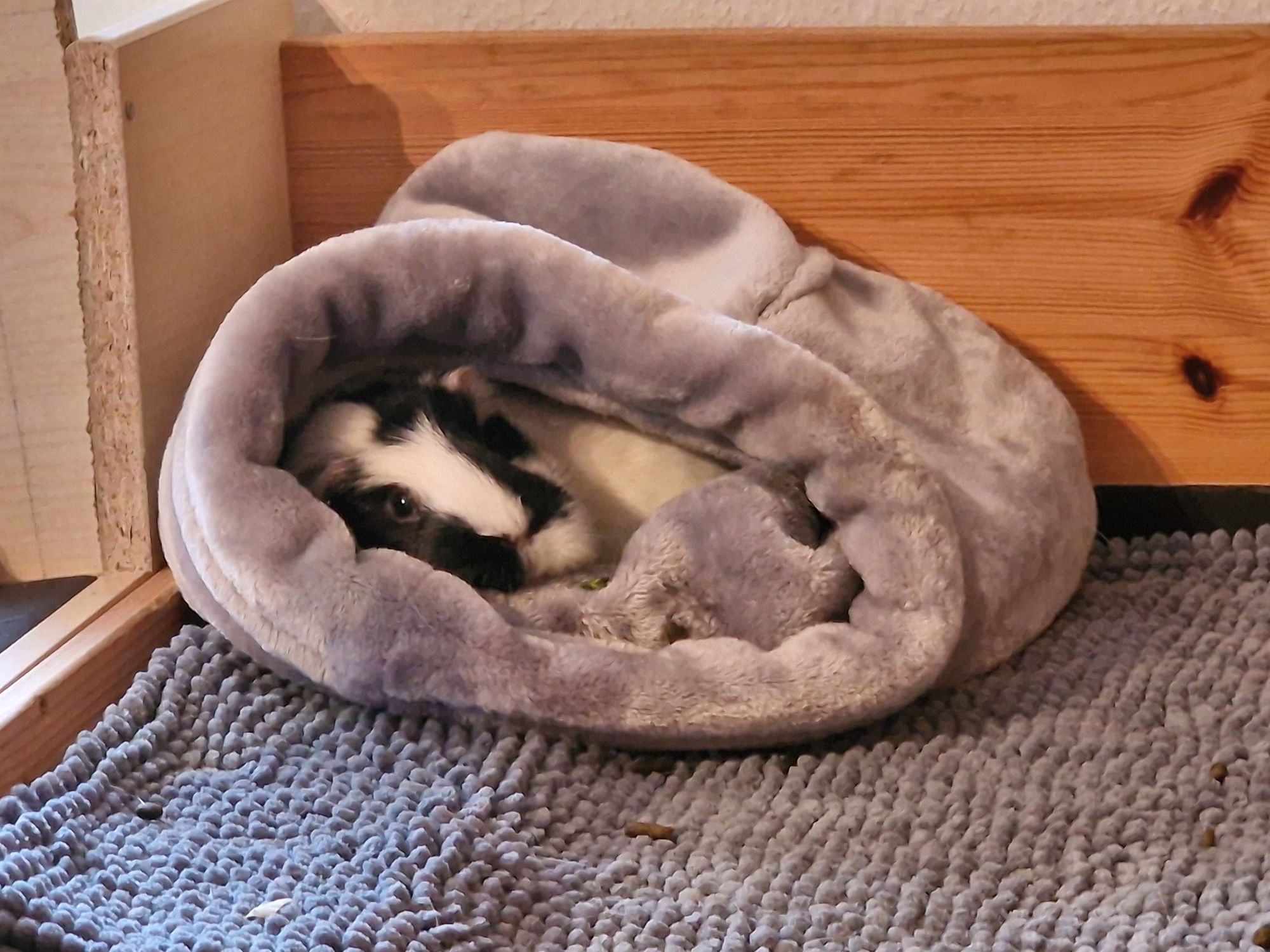 Und ein dritter Punkt: meine Schweinchen begeistern sich ab und an mal für neue Kuschelsachen, z.B. für Kuschelrollen, oder Kuschelhäuser. Da ist das Problem, dass die Begeisterung nur zeitweise da ist und diese Sachen eben nicht immer genutzt werden.