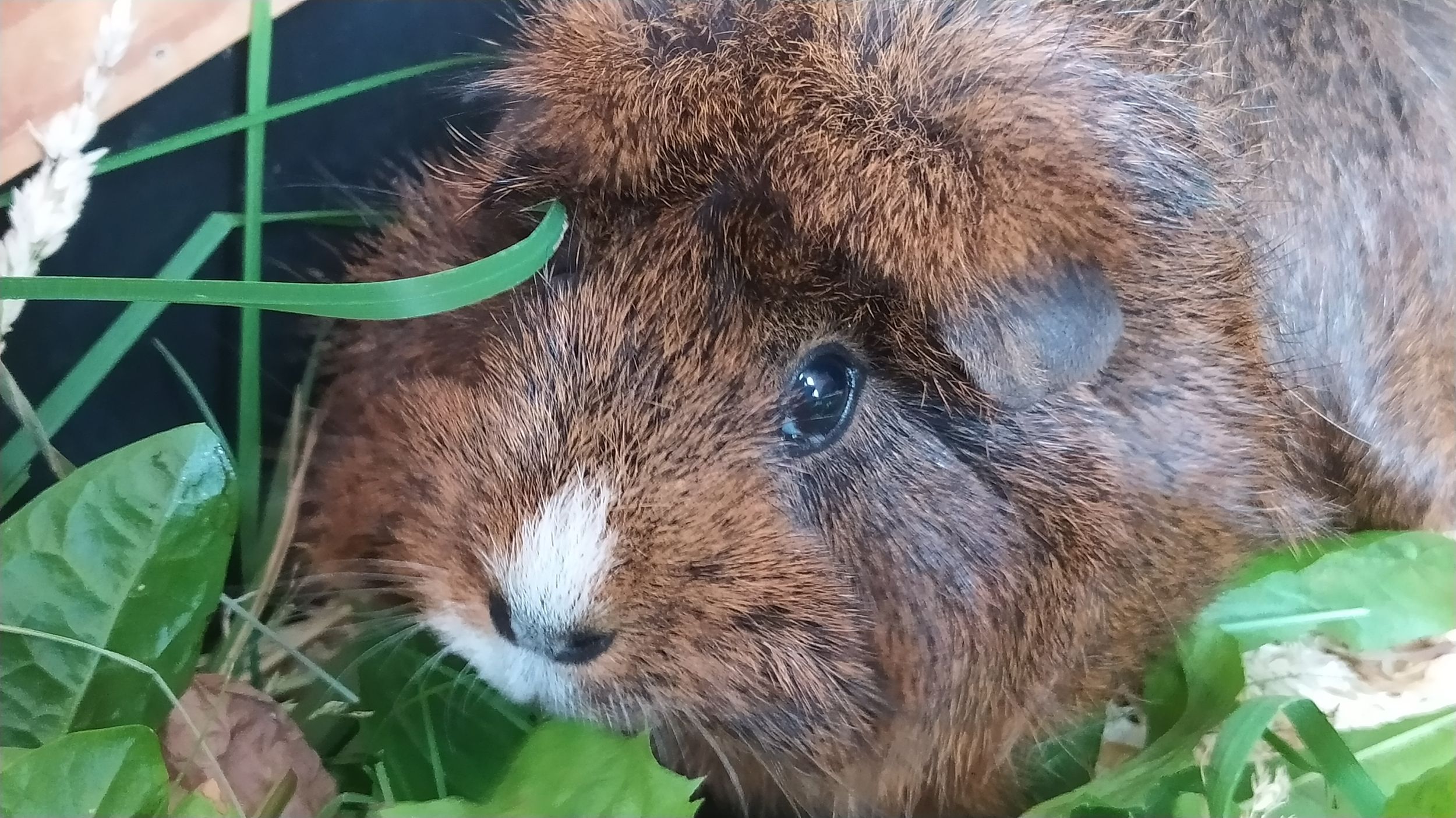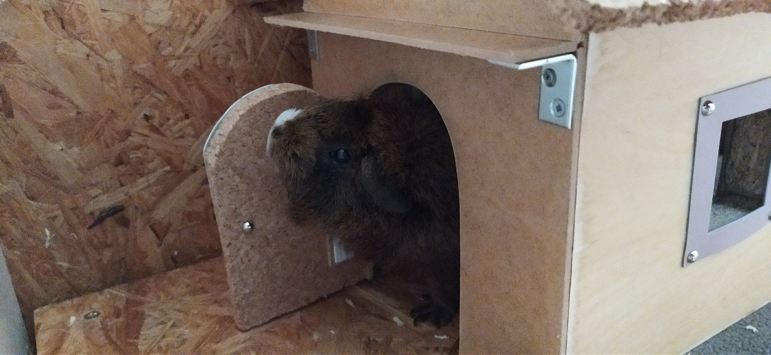 Chocolate kam als Winterüberraschung am 26. Februar 2019 zur Welt. Ihre Mutter lebte in Außenhaltung. Keiner wusste von der Schwangerschaft und plötzlich lagen 4 Jungtiere im Stall. Ihre Besitzerin setzte dann Chocolates Mutter und die 4 Jungen in ein beheiztes Gewächshaus zu den Wachteln. Solche Erlebnisse macht nicht jedes Meerschweinchen als Baby.