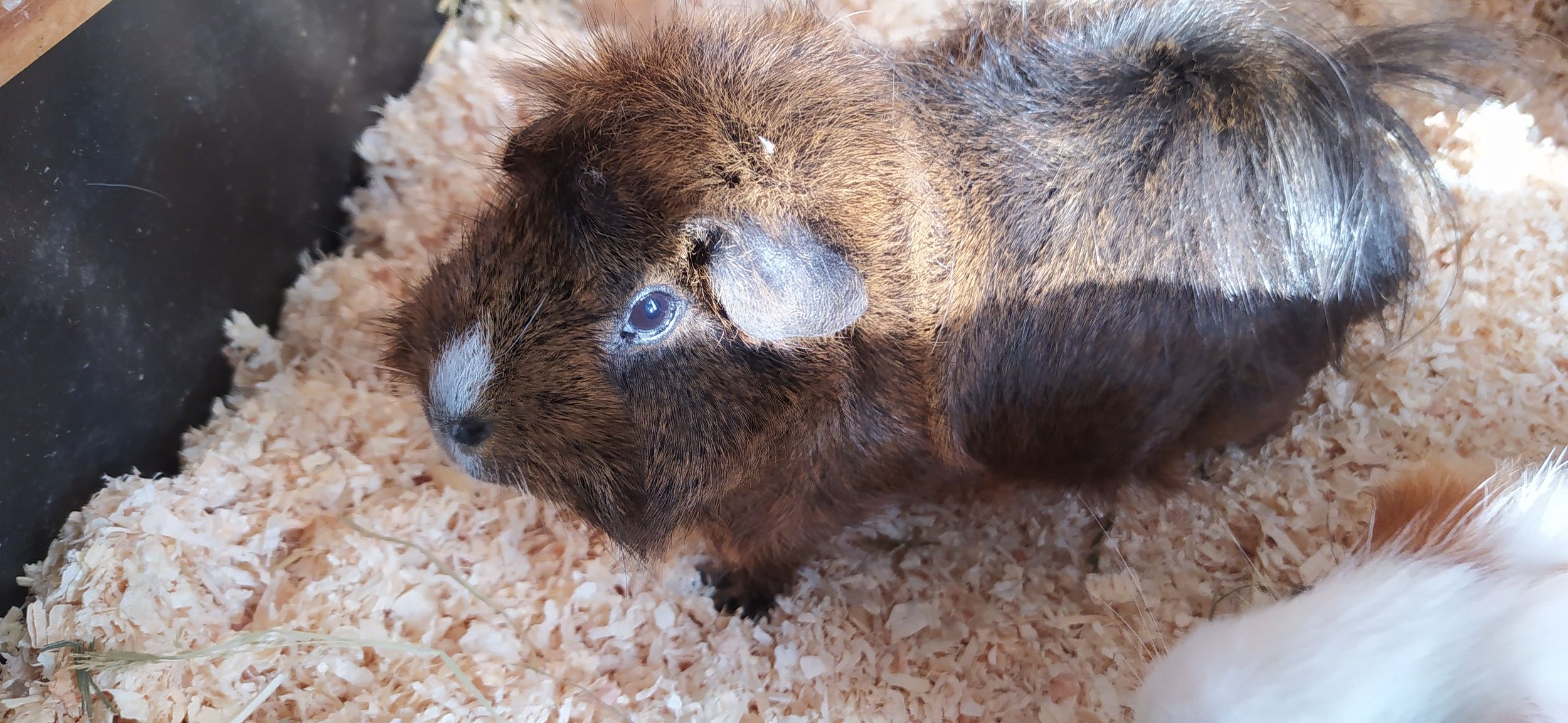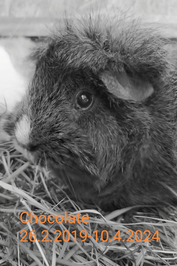 Chocolate war ein Rosettenmeerschweinchen mit außergewöhnlich langen Haaren, Goldagouti-Weiß. Das Weiß zeigte sich aber nur durch den kleinen Fleck auf der Nase. Mit so einer Färbung war dein Name schnell gefunden: Chocolate = Schokolade.
