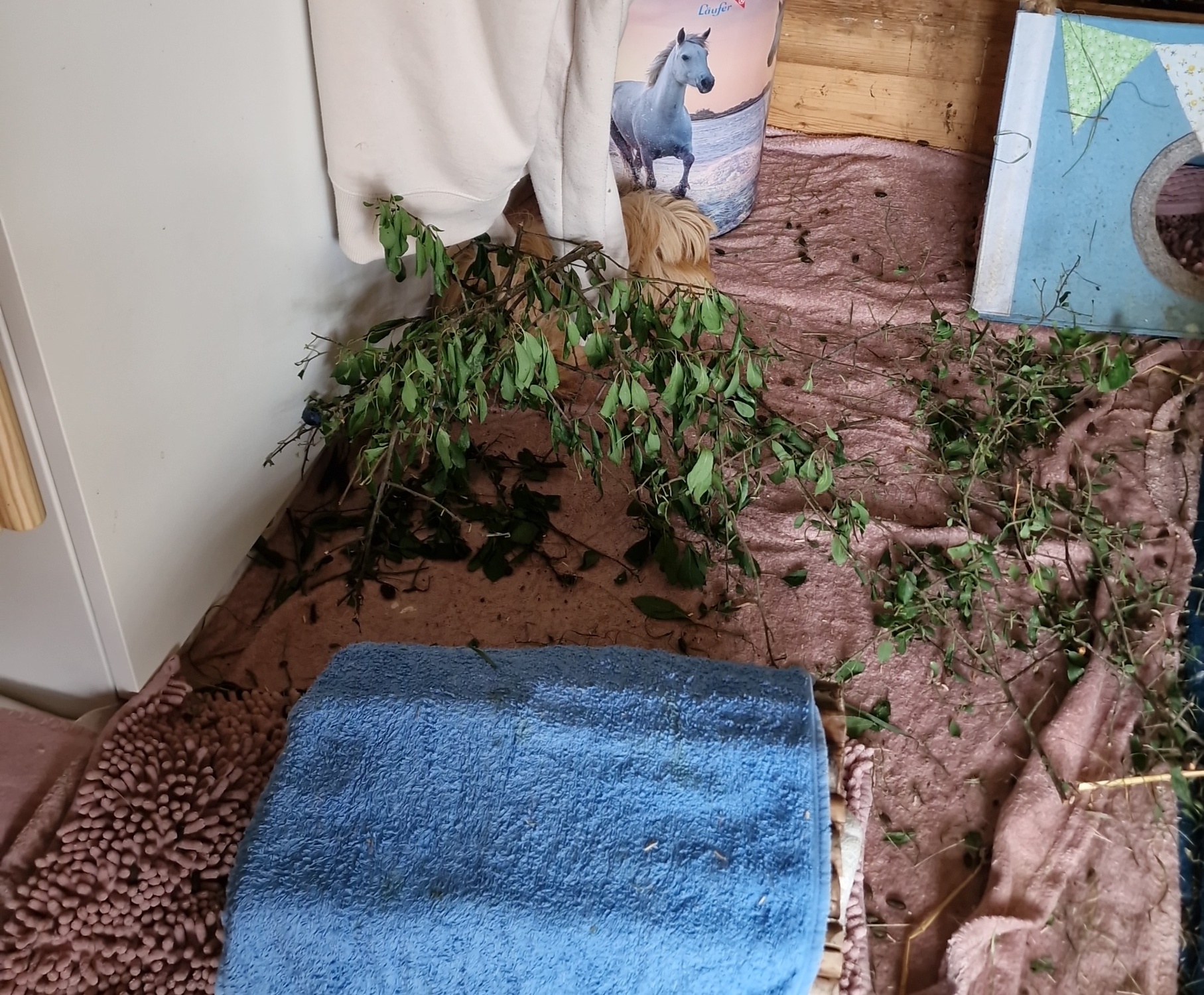 Luna war dick, mit Futterumstellung und umgebauten Gehege hat sie abgenommen. Sie ist immer noch schwabbelig, aber da ist der Schaden vermutlich schon passiert. Sie hält jetzt ihr Gewicht und wirkt gesund. Sie ist aufgrund ihres Gewichts aktuell kein Fall für den Tierarzt für mich.