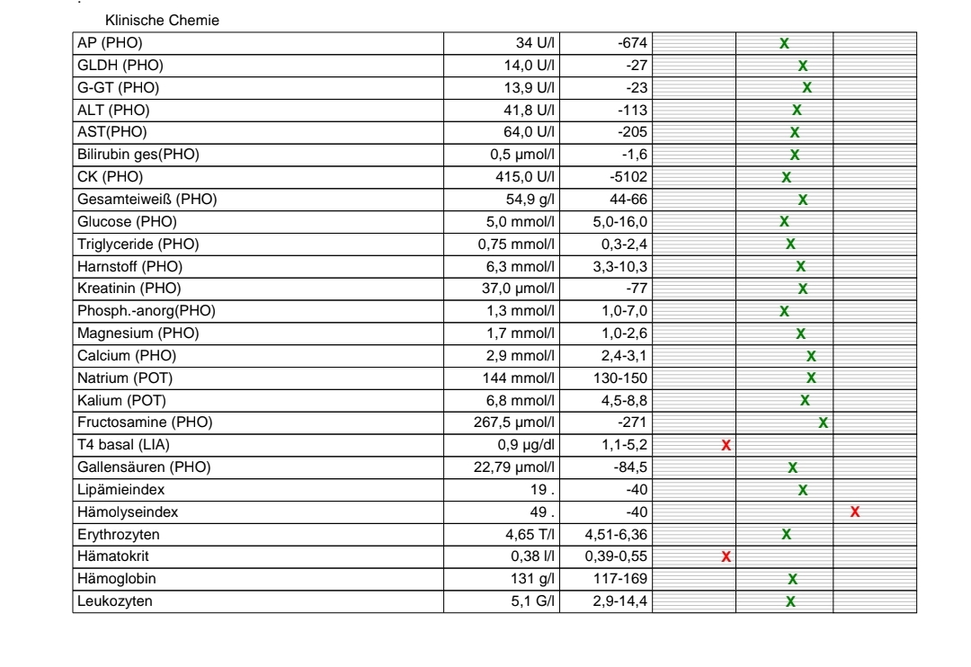 Ich habe gesehen, dass die TiHo eine Studie zu besseren Referenzwerten bei Meerschweinchen im Bezug auf die Schilddrüse gemacht hat. So niedrig sind Helgas ja nicht. Aber auffällig ist sie ja, also selbst wenn sie nur minimal zu niedrig sind, zeigt ihr klinisches Bild ja eine klare Einschränkung. Die Ödeme machen mir schon sehr Sorgen.