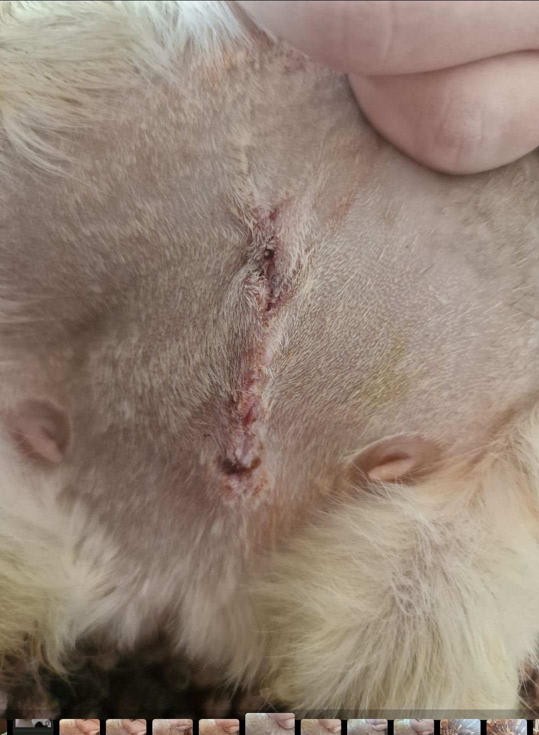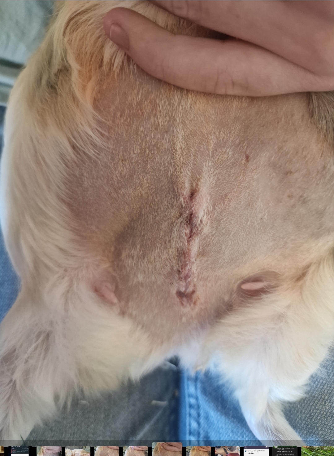Sie ist 4,5 cm groß, also genauso groß wie ihre große Zyste und vom Gefühl her kleiner als Tildes. Wobei Tilda auch grundsätzlich kleiner ist und deswegen vielleicht die Narbe größer wirkte. Sie hatte aber keine großen Zysten. Auf jeden Fall ist Malulis Narbe relativ klein.