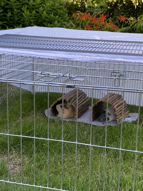 Es gibt hier kaum Fortschritte, was wohl an der Aussenhaltung liegt( vermute ich) . Ich besuche zwar öfter die Schweinis, aber dann liegen sie meistens in einem Häuschen. Wegnehmen möchte ich die aber nicht, weil sie sie so sehr lieben. Frisches Futter, egal ob Gras oder Gemüse, lockt sie auch nicht hervor. Überhaupt fressen sie sehr wenig Gras. Suchen sich den Löwenzahn raus, Gurke, Möhrengrün und bisschen Paprika geht auch, alles andere bleibt liegen. Dabei biete ich viele verschiedene Sachen an.