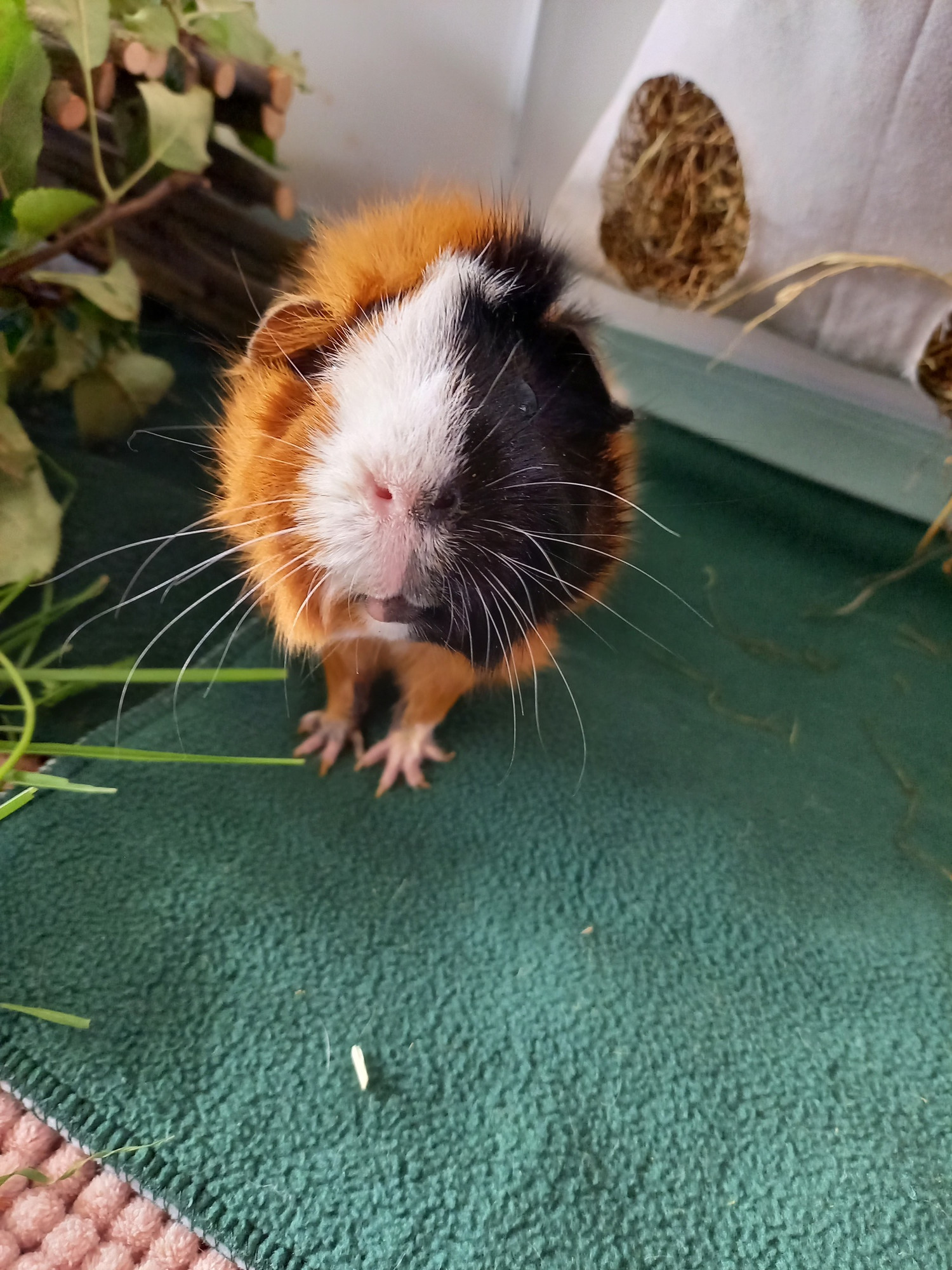 ...nachdem er sich davon erholt hatte, war er 1,5 Jahre Leihschweinchen für einen einsamen Bock, und durfte nun bei uns in sein für-immer-zuhause einziehen. Er ist supermutig und lässt sich schon nach 3 Tagen aus der Hand füttern und unterm Kinn kraulen