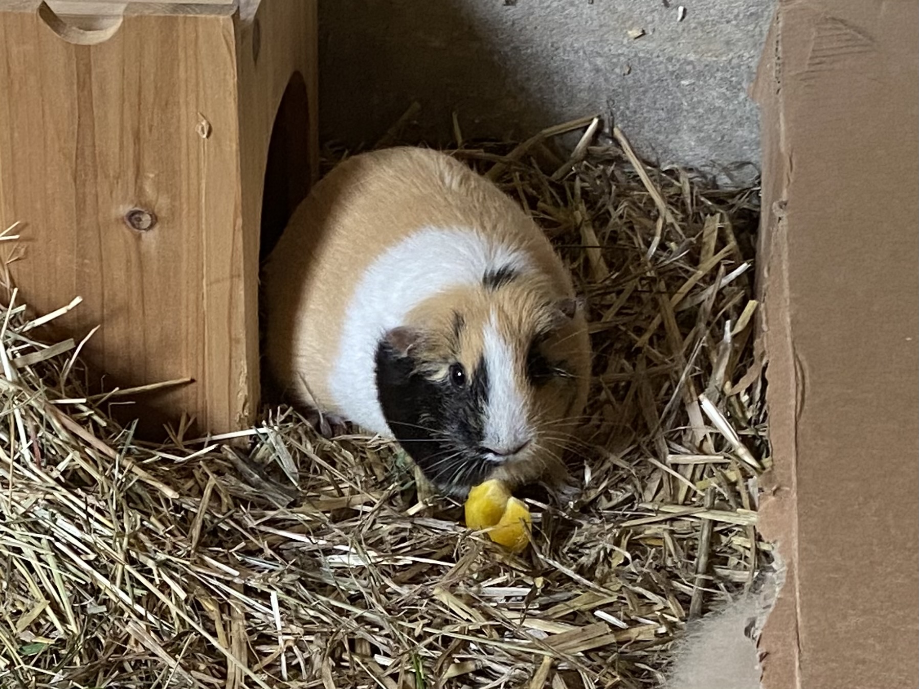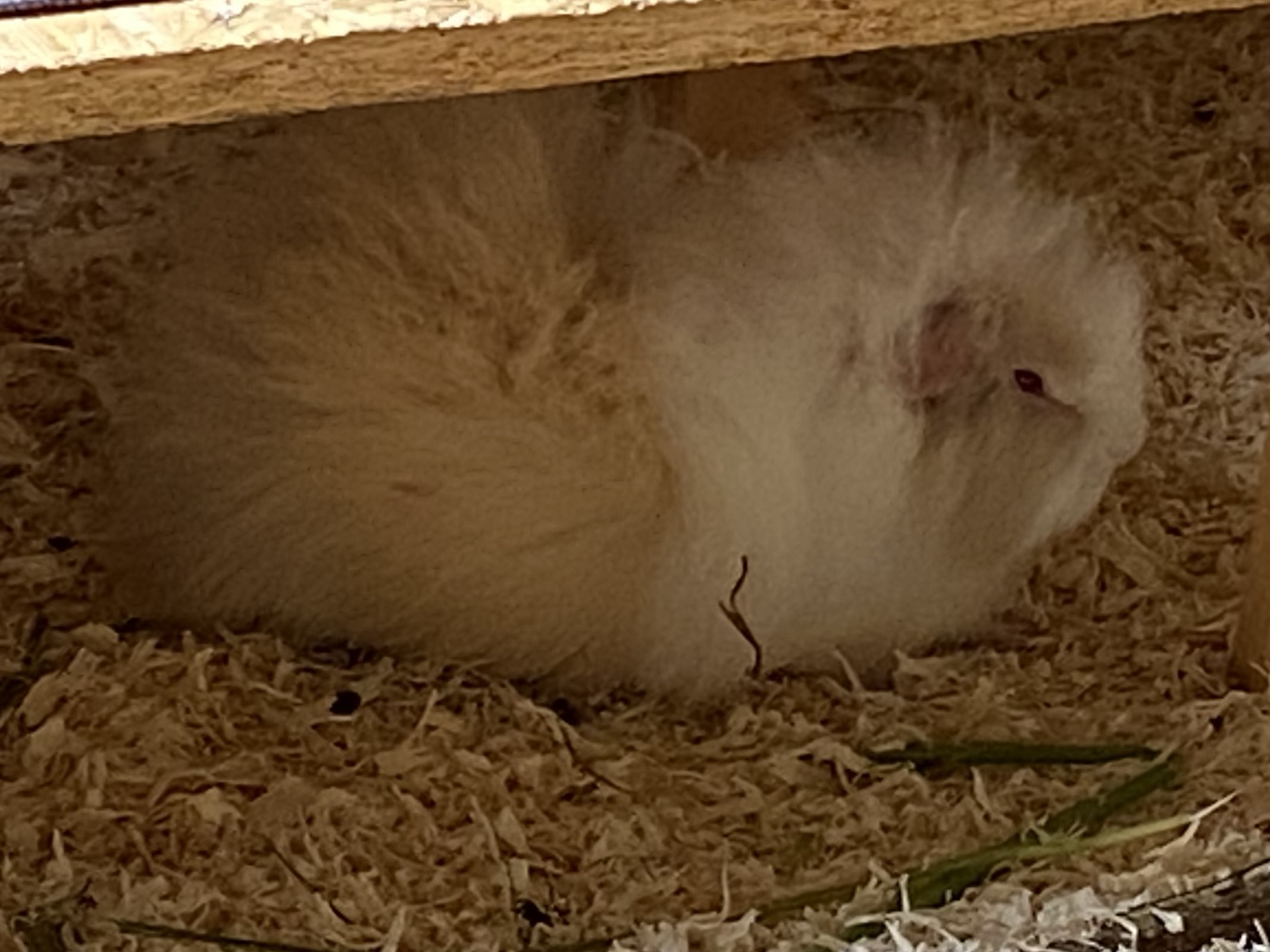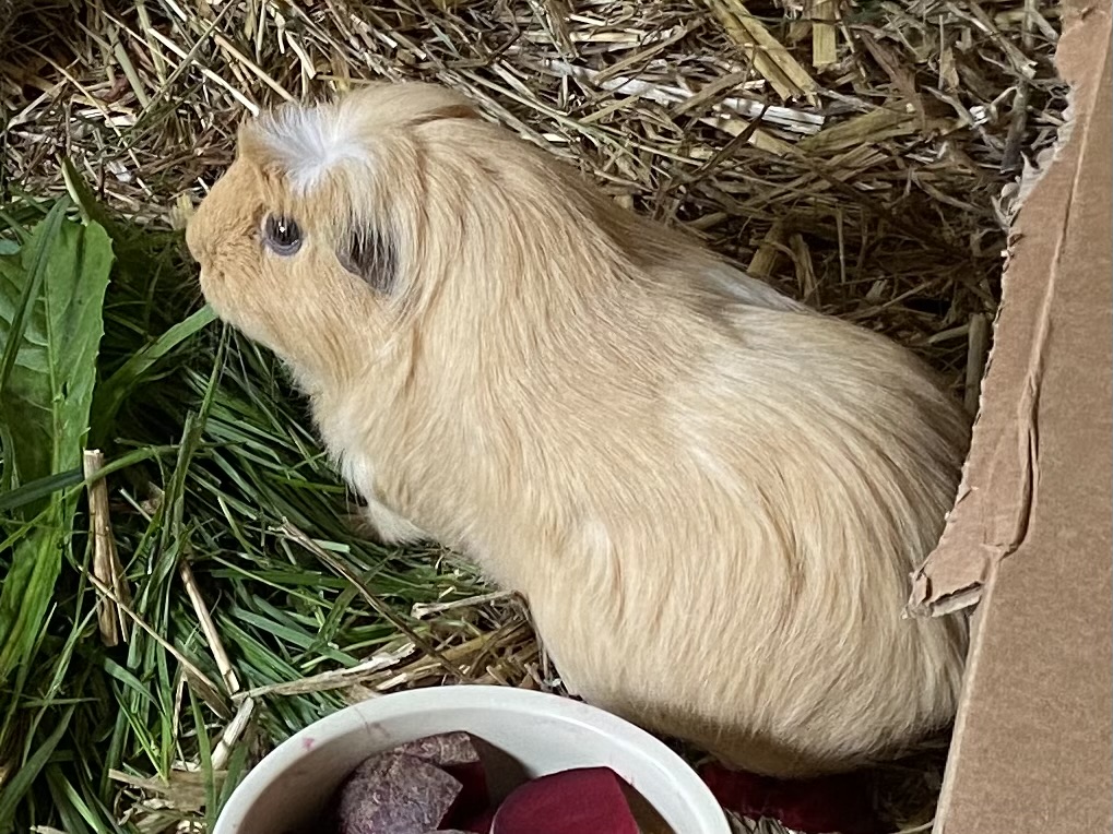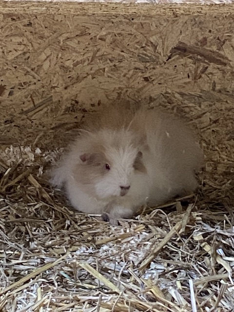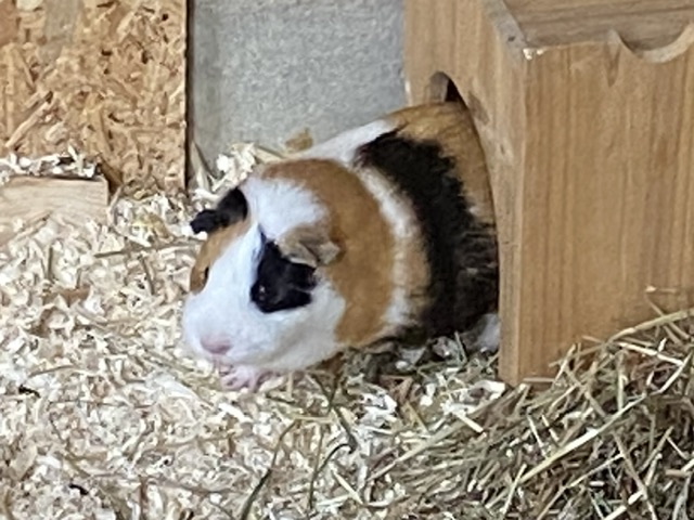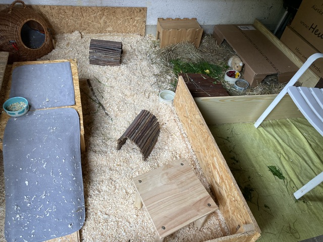 Mittlerweile hat sich einiges getan. Marie mußte ich leider abgeben. Sie hat sich aggressiv verhalten und zwei Schweinchen über eine Woche gejagt und gebissen. Da ich nicht zwei Gruppen versorgen kann, mußte sie leider gehen. Nun lebt sie wieder mit nur einem anderen Meerschweinchen und es klappt. Dafür ist ein anderes Meerschweinchen eingezogen. Dieses lebte in einer größeren Gruppe und es gab nur die übliche Klärung der Rangordnung. Nach 2Stunden war das erledigt. Das Gehege habe ich auf 3,5qm erweitert.