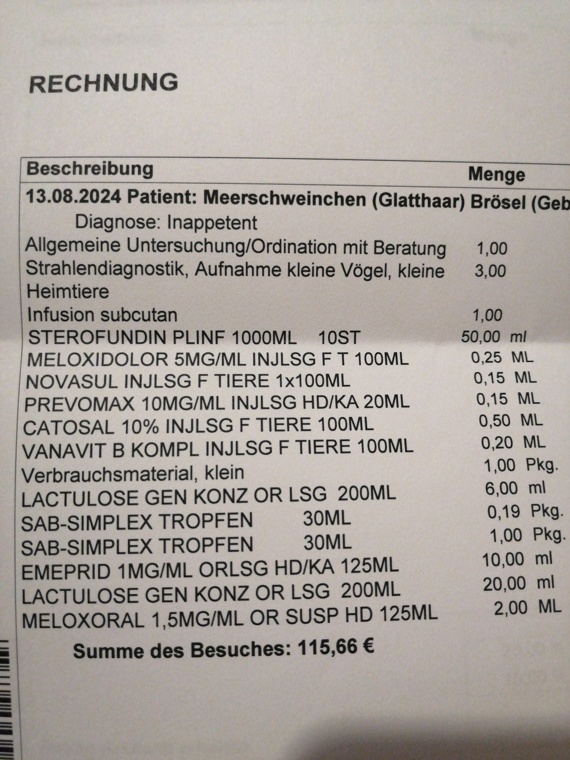 Wir sind dann direkt zur TÄ gefahren. Sie wurde genau abgetastet, Ohren, Zähne mit Otoskop untersucht. Temperatur war 39,5 und der Bauch auch gebläht. Sie hat dann jeweils 2 Röntgenbilder vom Kopf und Bauch gemacht. Darauf war Luft im Magen, eine größere Verstopfung und vergrößerte Zahnwurzeln im Unterkiefer zu sehen, die Kauflächen sind aber schön glatt. Die TÄ hat als Ursache der Verdauungsprobleme die Zähne in Verdacht. Sie möchte noch weitere Untersuchungen in Narkose machen und Medikamente zur Schmerzlinderung, Kreislaufstabilisierung, Verdauungsanregung intravenös verabreichen, Lactulose und Simeticon natürlich auch. Brösel bleibt jetzt also dort, und ich soll um 17h wieder anrufen.