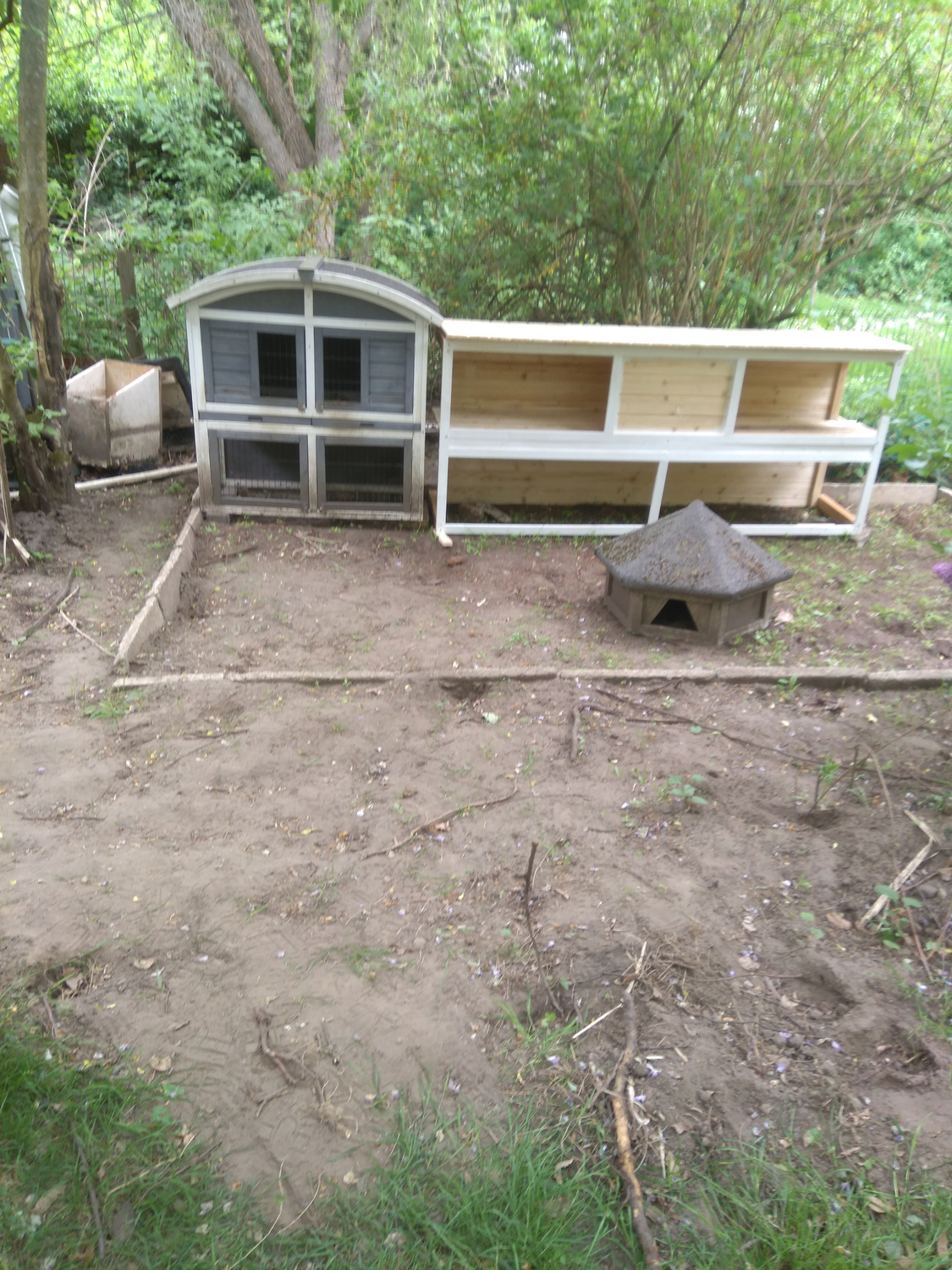 Etwas tiefer muß ich noch, dann kommen ringsrum Kantsteine, die liegen schon da. Wenn die stehen, wird der Boden mit Maschendraht ausgelegt und die Erde wieder drauf gefüllt. Schon ist das Gehege vor Untergraben geschützt.