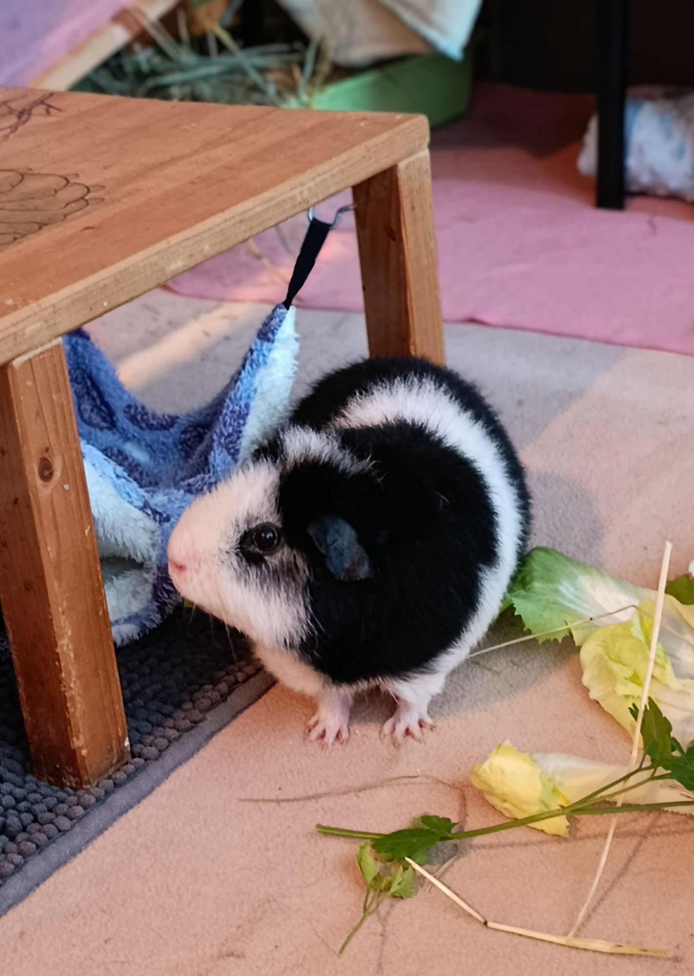 Die Schweinzis, wie wir sie nennen, sind bei uns ins Wohnzimmer in ein 120 x 60 cm Fleece Gehege gezogen. Zuerst sind sie nur in einem Häuschen meist übereinander gesessen und nur herausgekommen wenn wir nicht da waren (sie haben Spuren hinterlassen 💩😉). Als sie dann anfingen herumzuflitzen haben wir gesehen: die brauchen mehr Platz! Songmics sei dank, hätten wir das gleich erledigt. Tini und Krümel haben sich gut verstanden, sich oft gegenseitig bebrommselt und sind viel herumgelaufen. Tini war gleich sehr zahm, Krümel eher schüchtern. Letzten Winter wurde es ruhiger im Gehege, ich dachte mir nichts dabei, sind halt älter geworden. Und dann fiel mir auf, dass das Gemüse nicht mehr komplett aufgefressen wurde. Und dann habe ich bei Krümel die dicke Backe gesehen. Der Kieferabzess kam von einer Fehlstellung der Backenzähne mit Brückenbildung. Bei der folgenden OP wurde der Abszess entfernt und die Zähne korrigiert. Wir haben uns so bemüht, ich habe Krümel 2 Wochen lang alle 2-3 Stunden gepäppelt, mehrfache Kontrollen, verschiedene Tierärzte aber sie hat nicht mehr angefangen zu fressen. Anfangs hat sie beim Päppeln zugenommen aber sie hat sich immer mehr dagegen gewehrt und dann hat sie nicht mehr geschluckt. Ich war am verzweifeln, der Brei ist ihr aus dem Maul gelaufen, ich hatte Angst dass sie beim Päppeln erstickt. Sie war so arm, wir mussten sie gehen lassen.