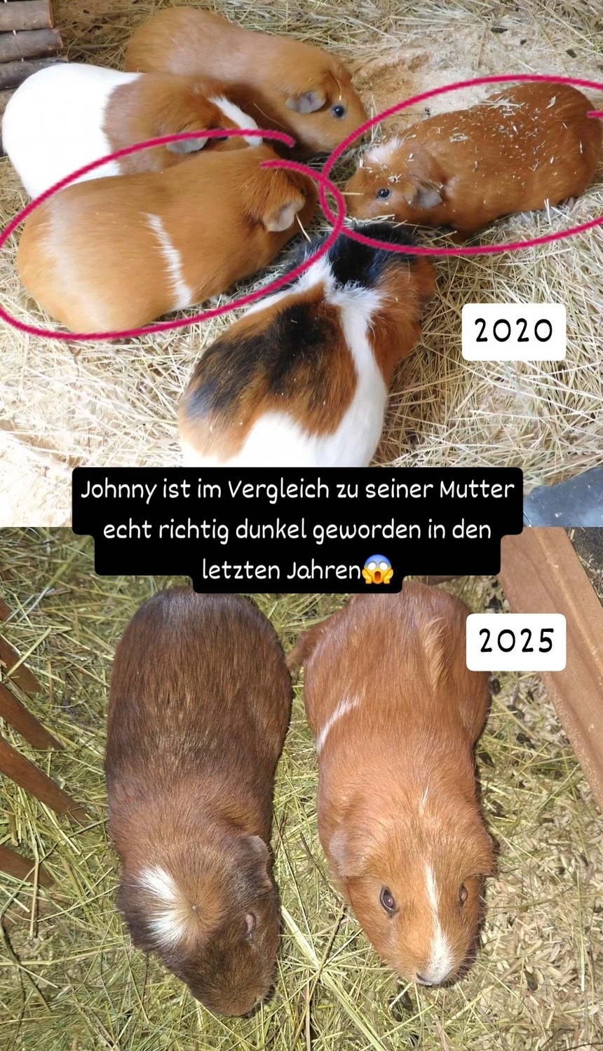 Wir hatten 2020 3 halberwachsene Böckchen von einer Frau übernommen, von denen 2 Wurfgeschwister sein sollten: Landolf und Miro. Der 3. war angeblich ein halbes Jahr älter: Scotty. Ich könnte mir aber vorstellen, dass sie trotzdem verwandt sind. Landolf und Scotty sind an den roten Stellen dunkelbraun geworden. Landolfs Bruder Miro hatte auch mit viereinhalb Jahren seine schöne unveränderte rote Farbe. Und die beiden sahen sich sonst so ähnlich, dass ich glaube, dass sie Wurfgeschwister waren.