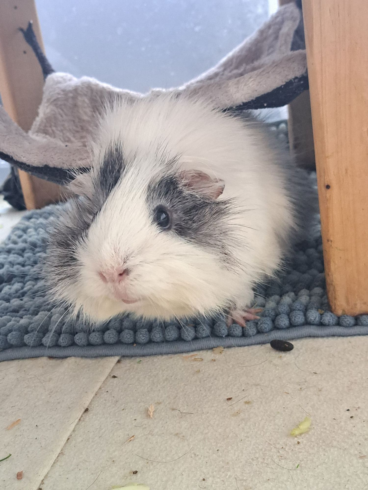 Die Vorbesitzerin hat erzählt, dass sie sie vor etwas über 4 Jahren als Jungtier bekommen hat. Polly sollte ursprünglich mit ihrem gleichaltrigen Partnerschwein in eine bereits vorhandene 4er Gruppe, was aber damit endete, dass Polly die Nase komplett abgebissen wurde. Die musste dann in mehreren OPs aufwändig rekonstruiert werden. Narben davon sieht man jetzt noch an ihrer Nase, insbesondere an der rechten Seite. Danach blieben die beiden jungen Mädels dauerhaft nur noch zu zweit bzw lebten zeitweise noch 2-4 Kaninchen dabei. Polly war zu allem Übel wohl damals auch noch unwissend tragend übernommen worden und brachte ein viel zu großes, totes Einzelbaby zur Welt. Sie hat also damals wohl schon einiges durchgemacht in ihren jungen Jahren...