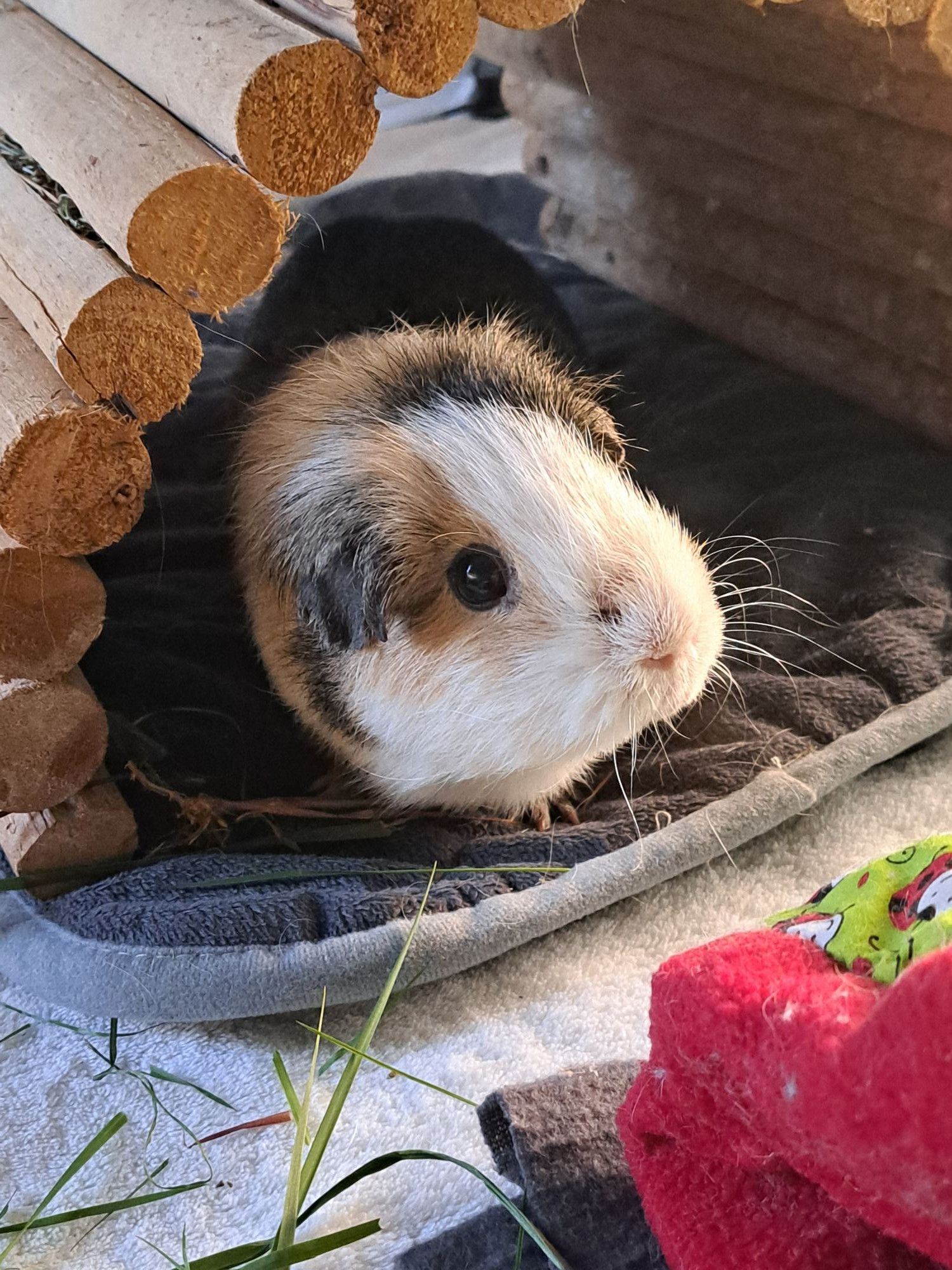 Am 24.11.2023 zog dann Nachwuchs in der Schweinebande ein. Nessaja stammt aus einer Notstation, dort landete sie, nachdem sie vom Vet.-Amt aus einem Animal-Hording-Fall beschlagnahmt wurde. Sie ist das "farbliche Wunschschwein" meiner Schwester.