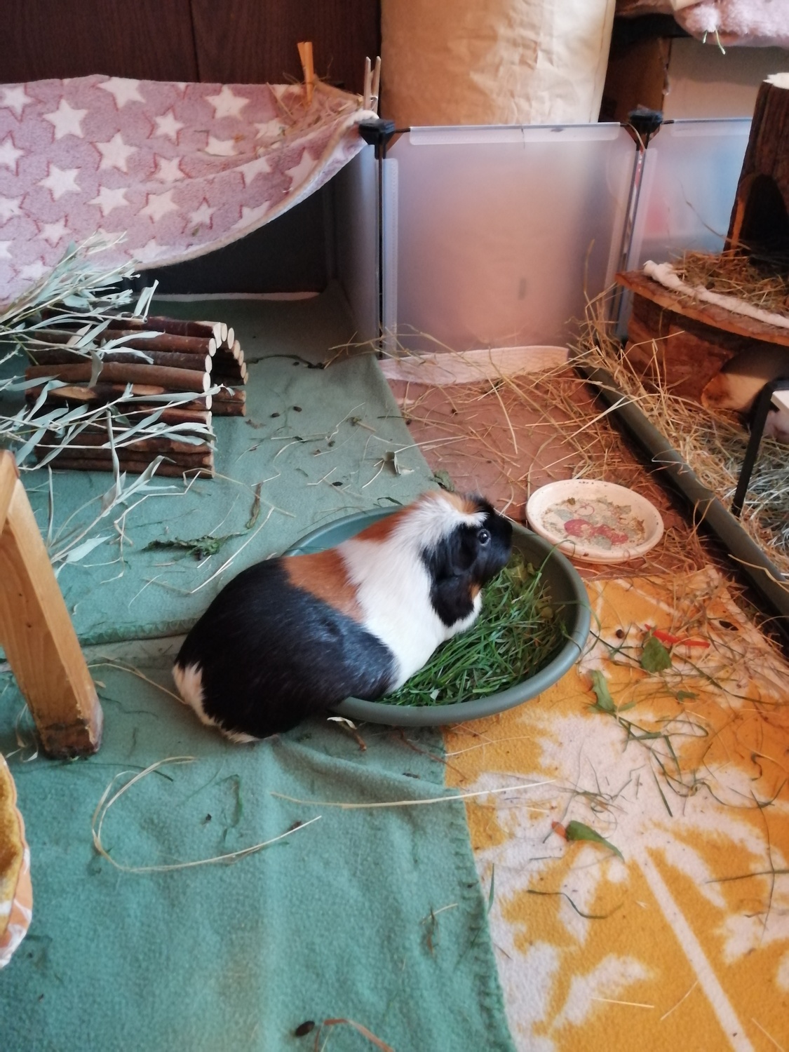 Ganz früher, als ich noch weniger Gemüse gegeben habe und wir nur 2-3 Meerschweinchen hatten, habe ich das gesamte Gemüse in Keramiknäpfen serviert. Aber damit würde ich heutzutage wegen Überfüllung nicht mehr weit kommen.