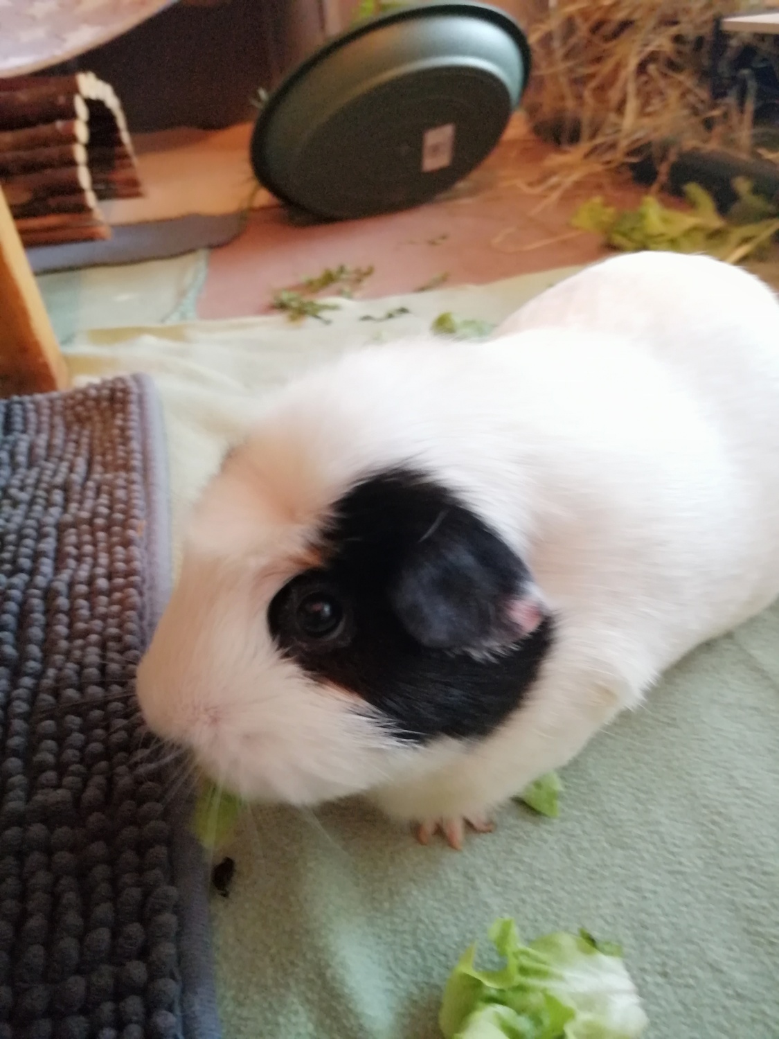 • Da unsere Schweinchen das ganze Zimmer nutzen, kann ich das Frischfutter leider nicht oft ausstreuen. (Ich bin im Fliegen noch nicht so geübt. ;) ) Die Regel ist daher, dass ich das Futter an einer strategisch günstigen, immer gleichen Stelle auslege. Die Unterlage sind wechselnde alte Kopfkissenbezüge. Das nach dem ersten Ansturm verbleibende Futter, schiebe ich meistens auf einem Haufen zusammen und befeuchte es etwas mit einer Blumenspritze.