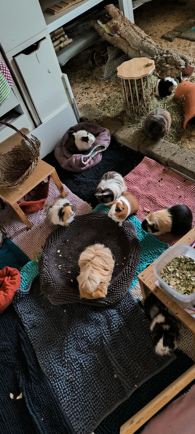 • Ach das geht total vom zeitlichen Aufwand. Ich stelle alle Einrichtungsgegenstände weg, also in den Streubereich oder außerhalb vom Gehege und dann schüttel ich die Teppiche in einen Behälter, der immer beim Gehege steht und dann werden die Teppiche ausgetauscht oder wieder reingelegt. Täglich mache ich das nur im vorderen Fleecebereich, da sie da am meisten sind, das dauert so 20-30 Minuten. Den Fleecebereich am Fenster und die Etage mache ich mit dem Streu alle 2-3 Tage, je nach Bedarf. Das verteilt sich da gut. Dauert auch ne gute halbe Stunde, außer ich muss das Streu großzügig sauber machen. Wenn ich alle unteren Schichten mit Inkos und Decken wechsel dauert das natürlich länger. Das mache ich vorne alle 3 Tage ungefähr und hinten auch nach Bedarf. Sie sind da nur sehr unregelmäßig. Ich hatte das saubergemacht abends letztens und morgens lag kein einziger Köttel da. Vielleicht nehme ich das zurück, dass das zeitlich kein Problem ist😂 Aber das Wegstellen geht fix, es ist eher der Rest, der mich stört. Also Köttel aus irgendwelchen Ecken holen oder das Gras, dass immer runterfällt. Also der Arbeitsaufwand wird mir nicht fehlen, wenn wir mal weniger Schweine haben. Die Schweinchen unten (2 auf 9 qm plus Etage) sind soooooooo entspannt. Die vergesse ich sogar manchmal, weil es nicht täglich so ein Arbeitsaufwand ist😂🫣
