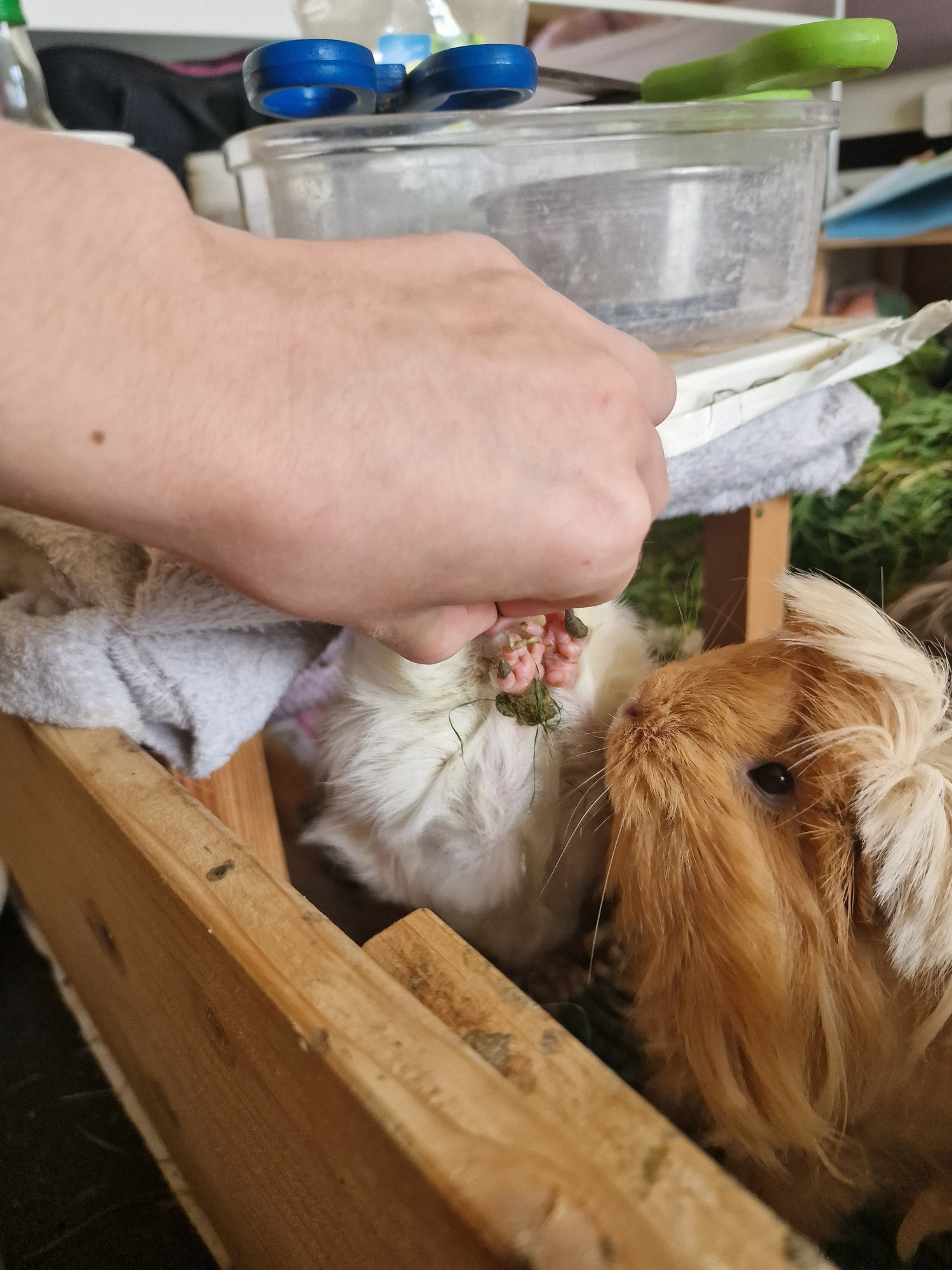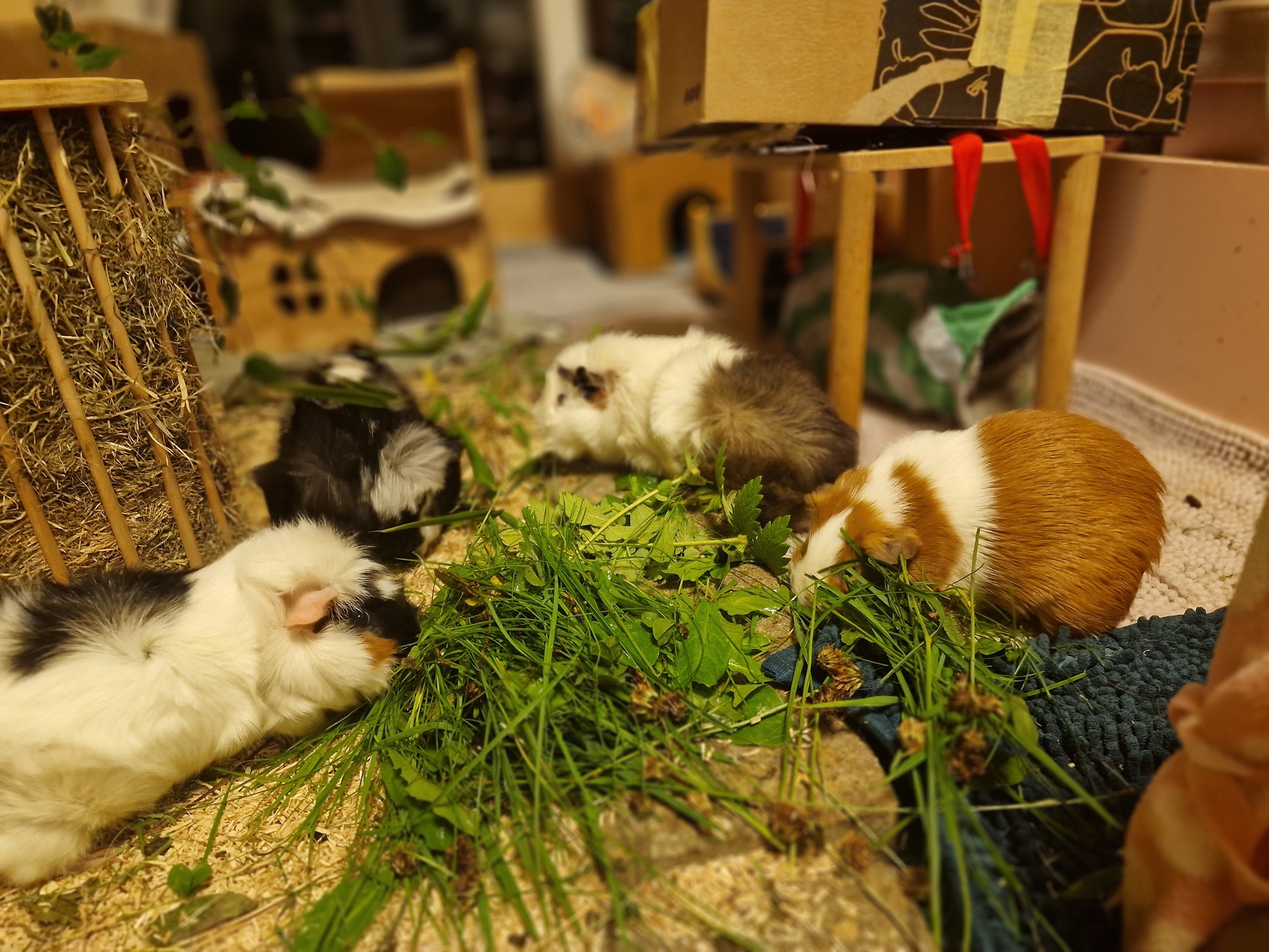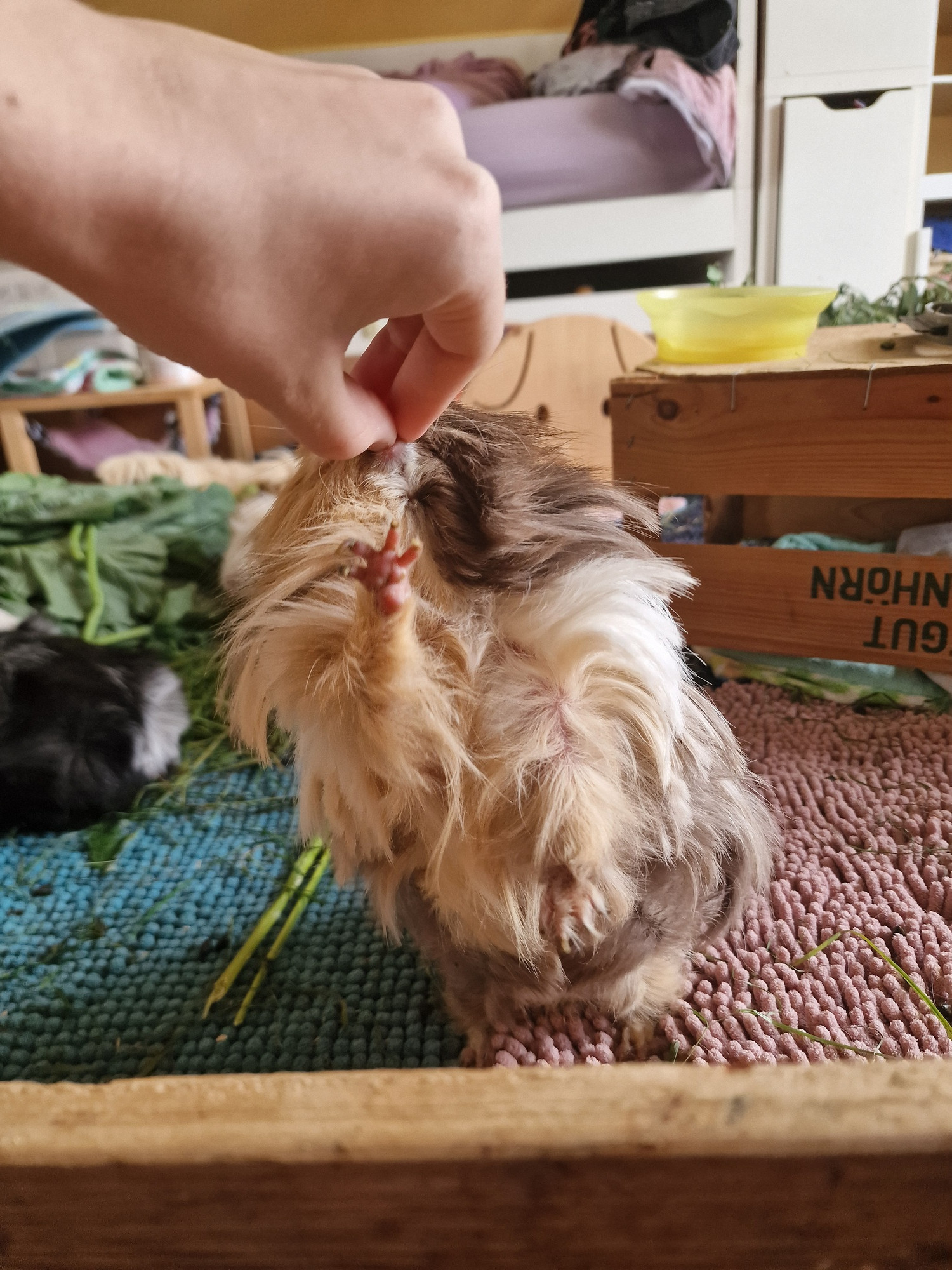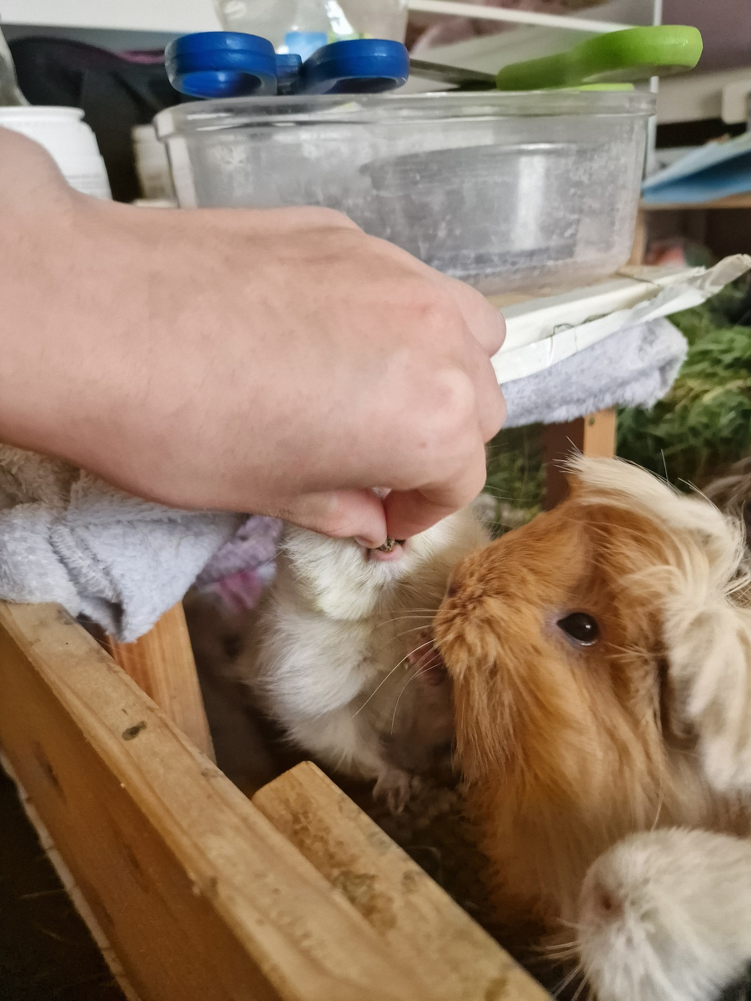 Wir haben Ozeana, Helga, Billy und Malu, die das bekommen oder bekommen haben. Friedel hat zwischendurch mit ihrer Pfote auch noch was genommen. Zudem ist die Flasche doof und es geht immer was verloren. Bisschen was ist auch noch drin, aber nichts was guten Gewissens noch reicht, ohne, dass ich dann doof dastehe, wenn das Metacam leer ist.