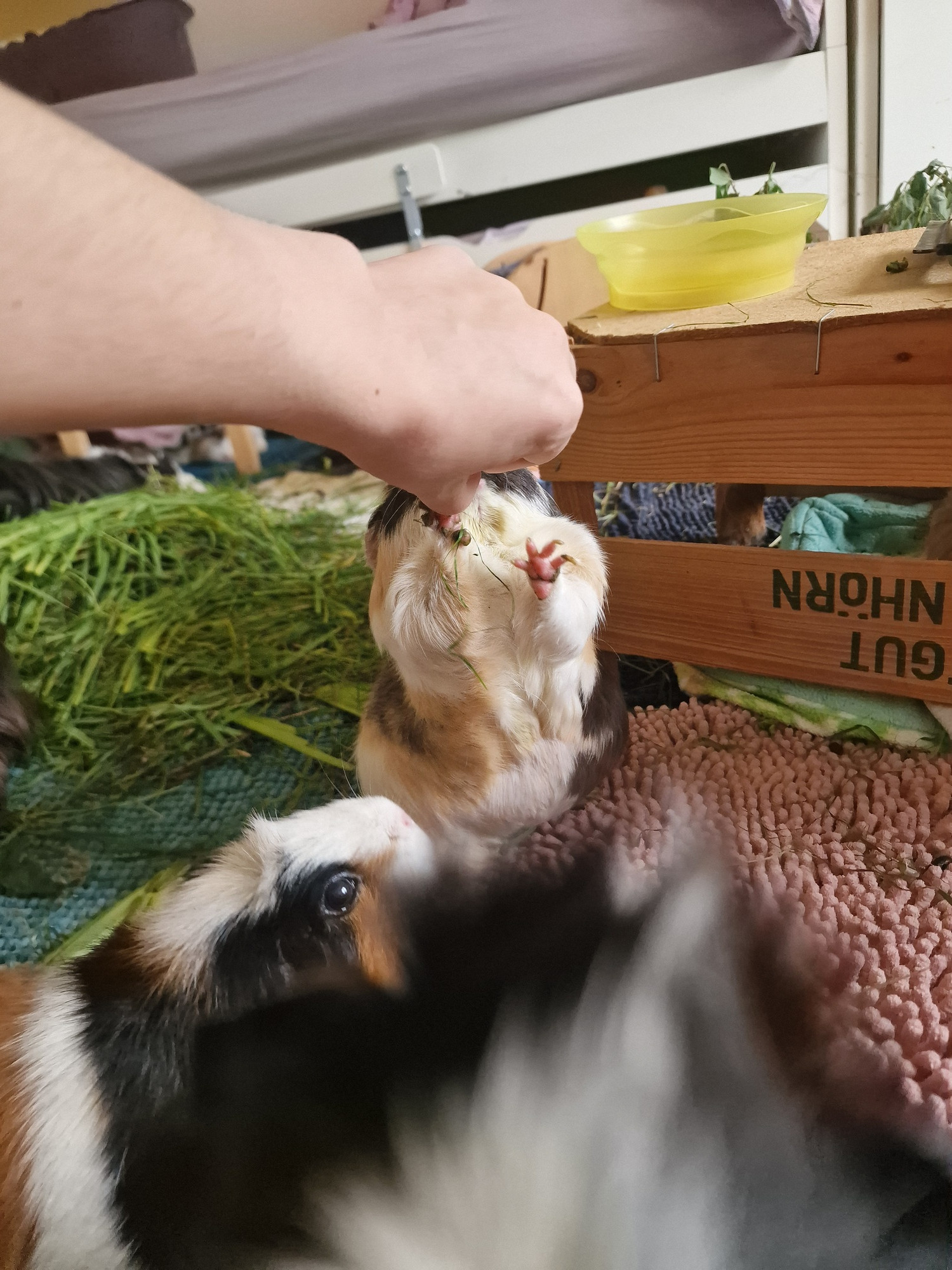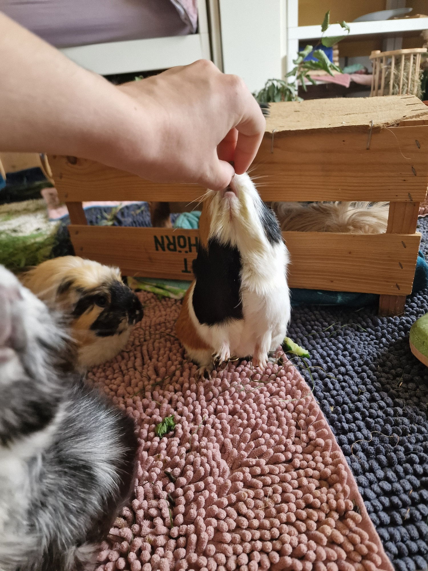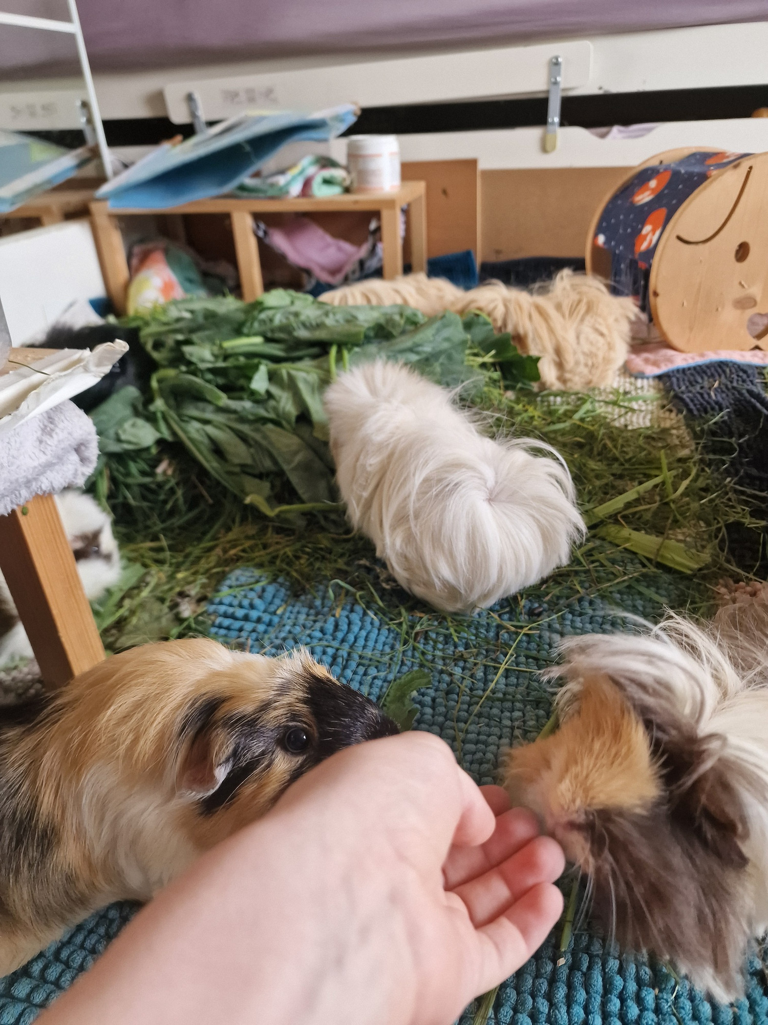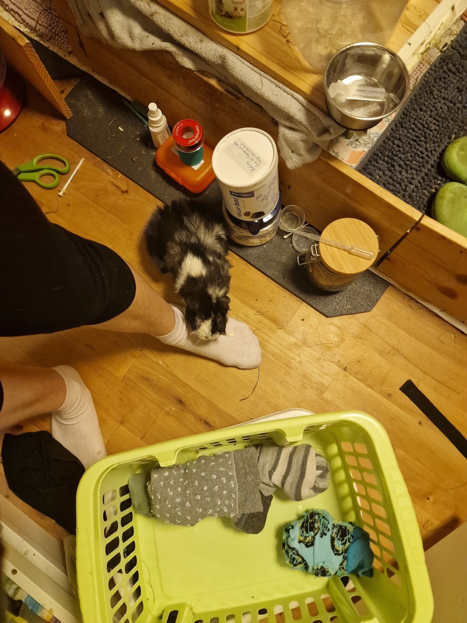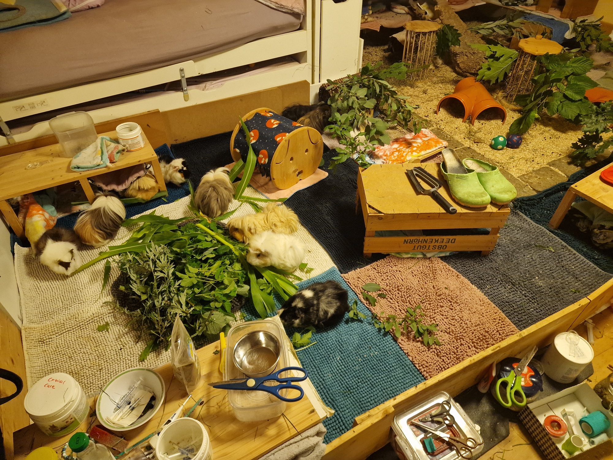 Wir haben Ozeana, Helga, Billy und Malu, die das bekommen oder bekommen haben. Friedel hat zwischendurch mit ihrer Pfote auch noch was genommen. Zudem ist die Flasche doof und es geht immer was verloren. Bisschen was ist auch noch drin, aber nichts was guten Gewissens noch reicht, ohne, dass ich dann doof dastehe, wenn das Metacam leer ist.