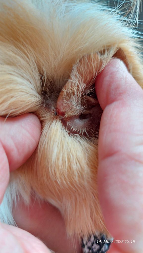 Ich tippe entweder auf einen Pilz. Aber der wäre dann sehr schnell gekommen. Oder auf eine Bisswunde. Dafür spricht vielleicht die winzige offene Stelle am Ohr (siehe Foto).
