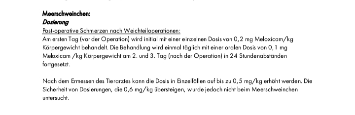 Bei Metacam ist das, was auf der Verpackung steht und was viele Tierärzte angeben anscheinend auf Katzen und Hunde (in anderer Verdünnung) abgestimmt, aber für Meerschweinchen viel zu wenig.