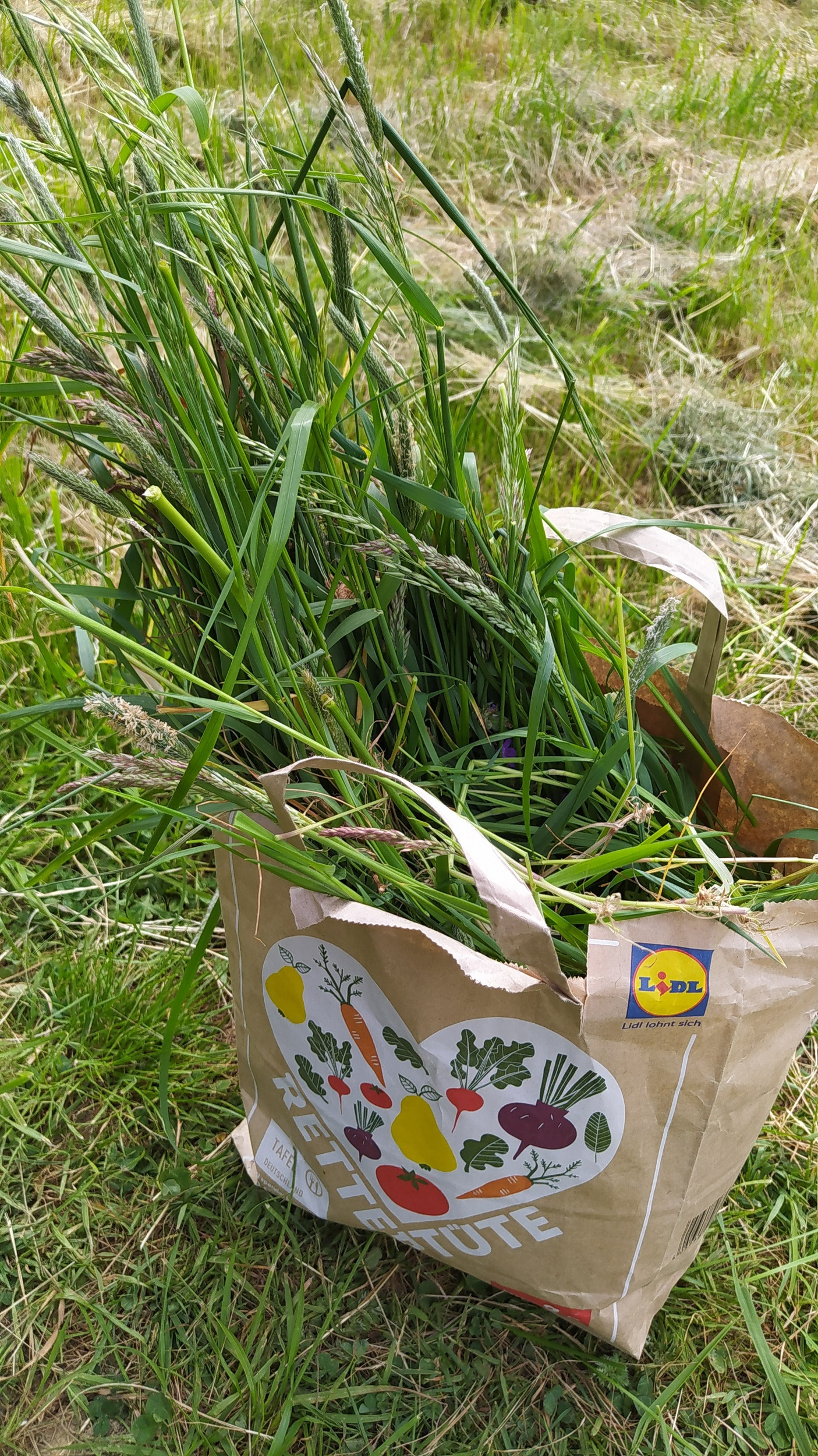 Wenn die Flächen hier in der Nähe gemäht worden sind oder zu eintönig erscheinen, habe ich für Hin- und Rückweg zusammen alleine rund 40 Minuten - zuzüglich der Zeit zum Sammeln. Daher hole ich dann auch Futter für 2-3 Tage. Gesünder wäre es natürlich, wenn man es vor der Verfütterung frisch schneiden würde oder zumindest nur einen Teil für den Rest des Tages im Kühlschrank lagern würde.