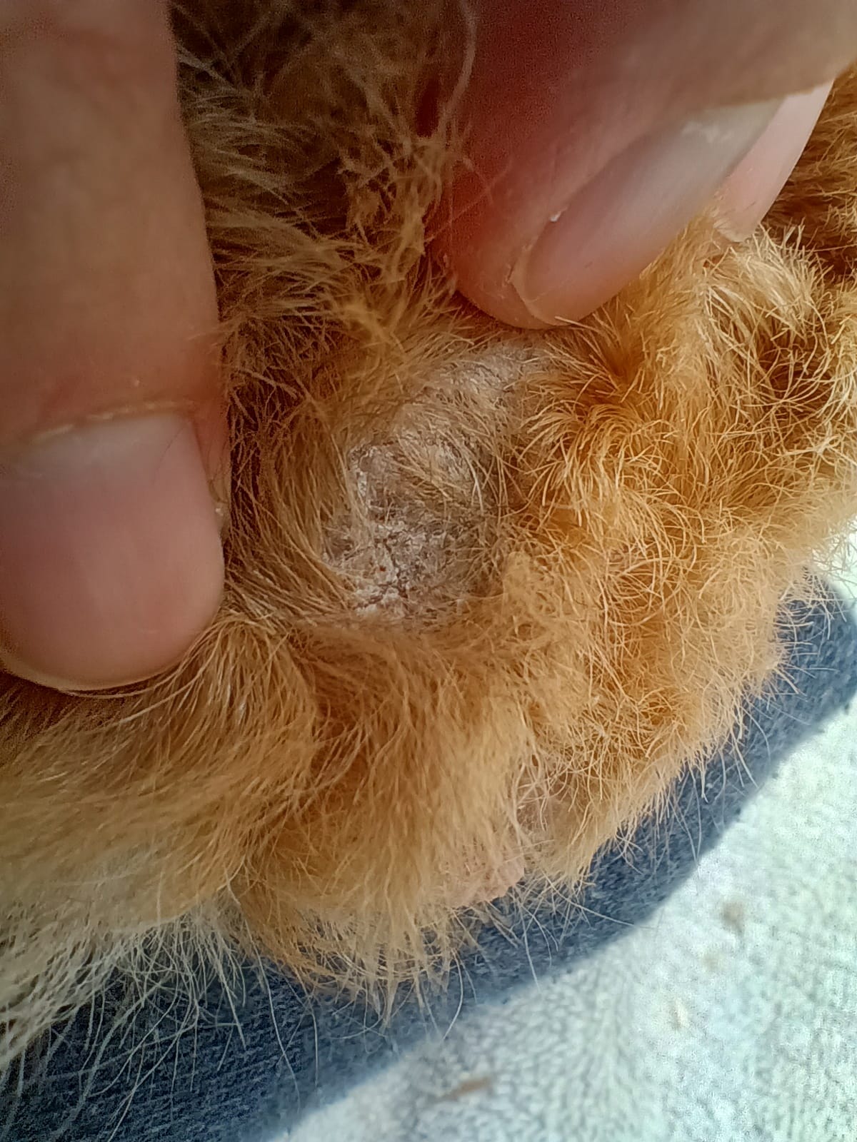 Als es mir aufgefallen ist, hatte er richtige Klumpen aus toten Hautzellen um den Haaransatz am Po kleben. Wir haben sie mit Kokosöl aufgeweicht und dann mit Wasser abgewaschen. Außerdem trägt er am Po jetzt eine Kurzhaarfrisur, aber ich hab sowas in dem Ausmaß noch nie gesehen. Ich hab leider nicht dran gedacht, von den Klumpen ein Bild zu machen, aber hab einen Tag später von der Haut Fotos gemacht. Hat das schon mal jemand gesehen und weiß, was es ist?