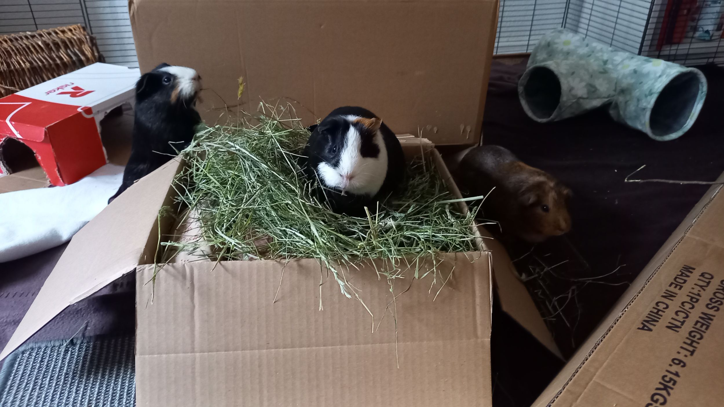 Wir werden es wohl erst heute Abend schaffen auszupacken. Wir sind mit allem hinterher, leider ist unsere Pixie am Freitag gestorben, und so ist die Wäsche der Schweinchen noch nicht mal fertig, obwohl heute Saubermachtag ist.