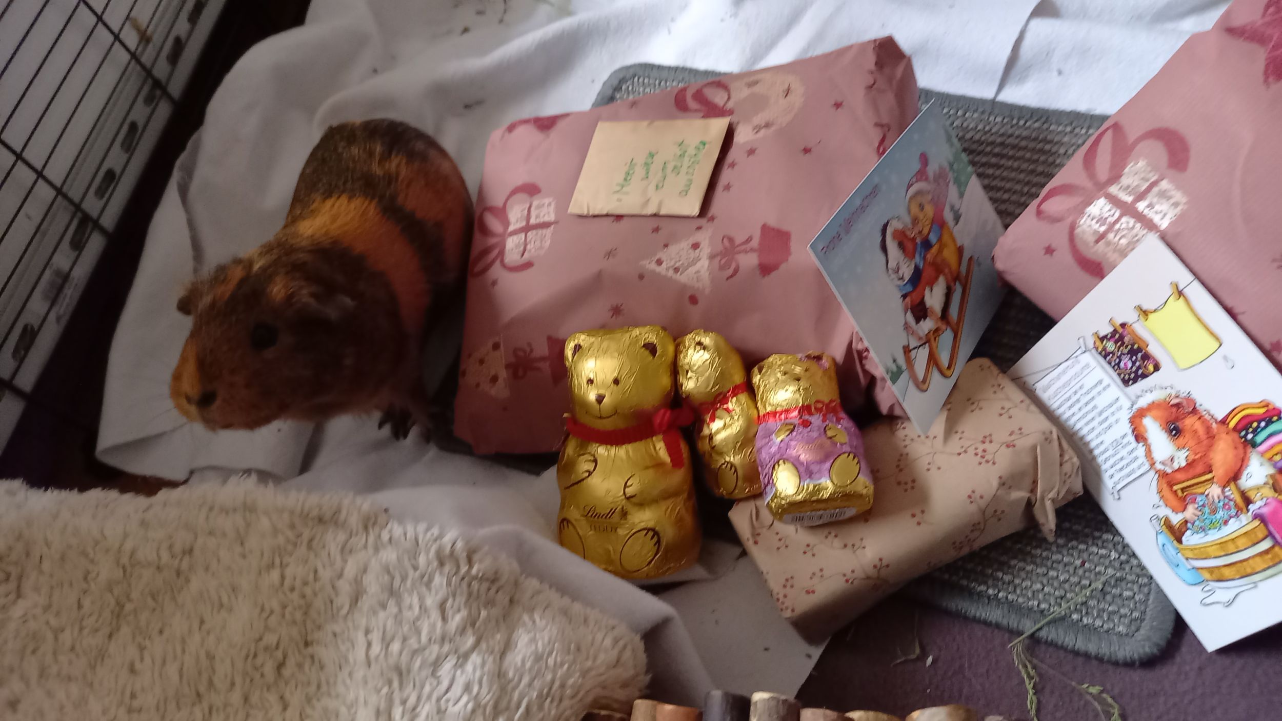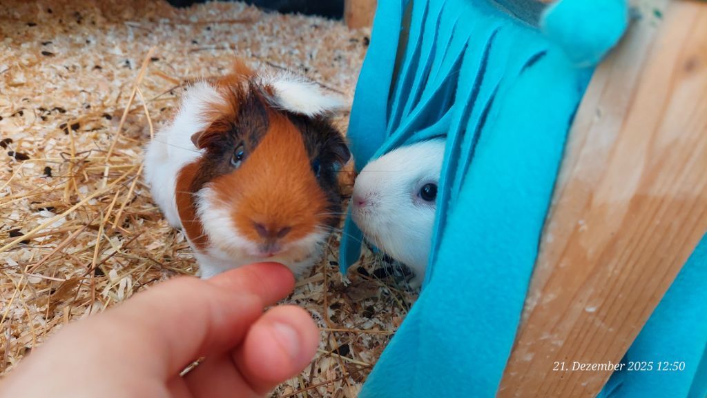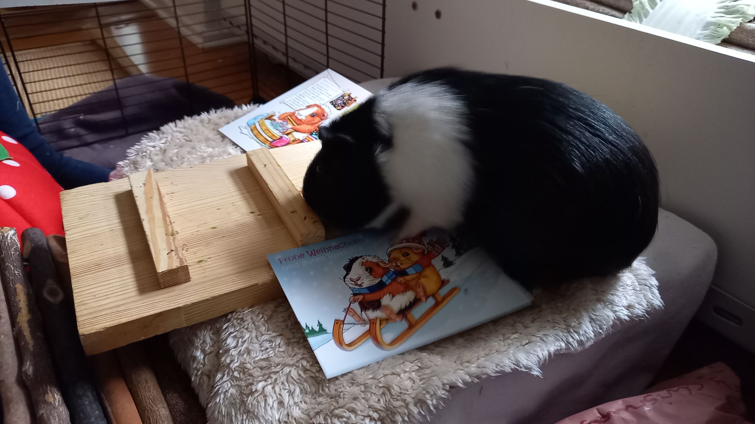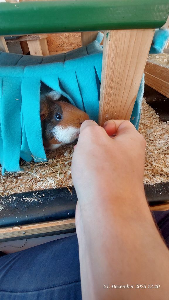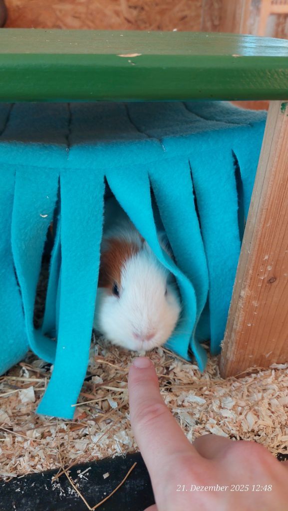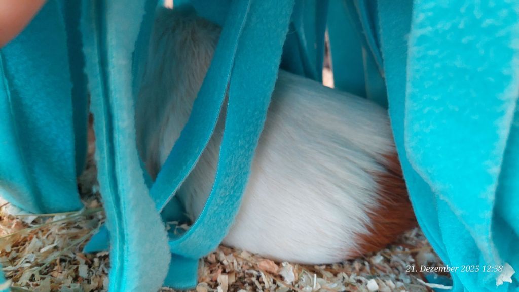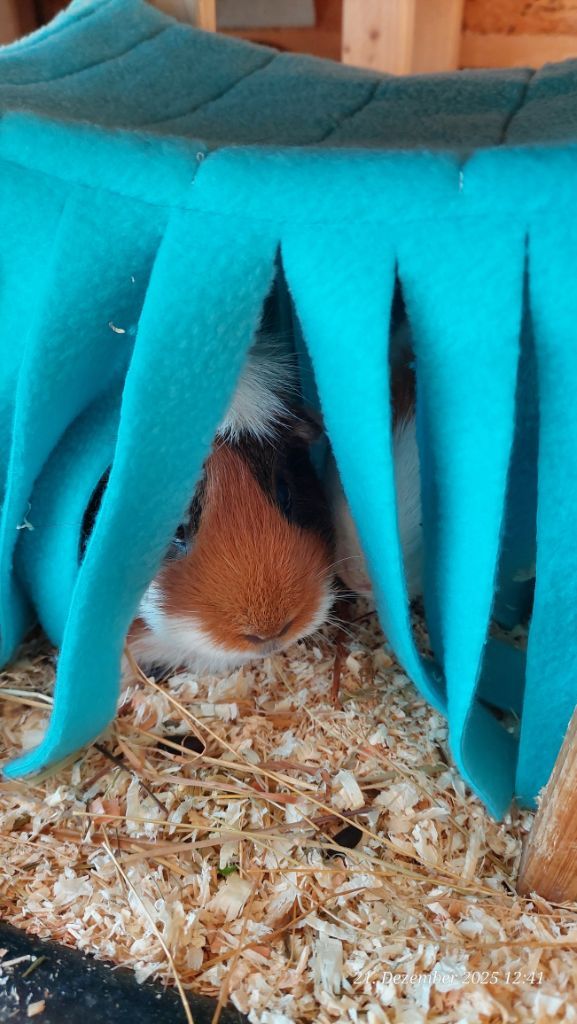 Hier einige Impressionen unserer Meerschweinchen-Wichtelbescherung. Hanni, Nanni und Simba waren begeistert von den kulinarischen Genüssen, dem leckeren Heu und vor allem vom neuen Kuschelsack. Sie sind gleich hindurchgelaufen. Sonst brauchen sie immer länger, bis sie sich in ein neues Kuschelobjekt trauen. Wir Menschen hier freuen uns auch sehr über den Inhalt des Pakets!!! soooo lieb alles ausgesucht und verpackt!!!!
