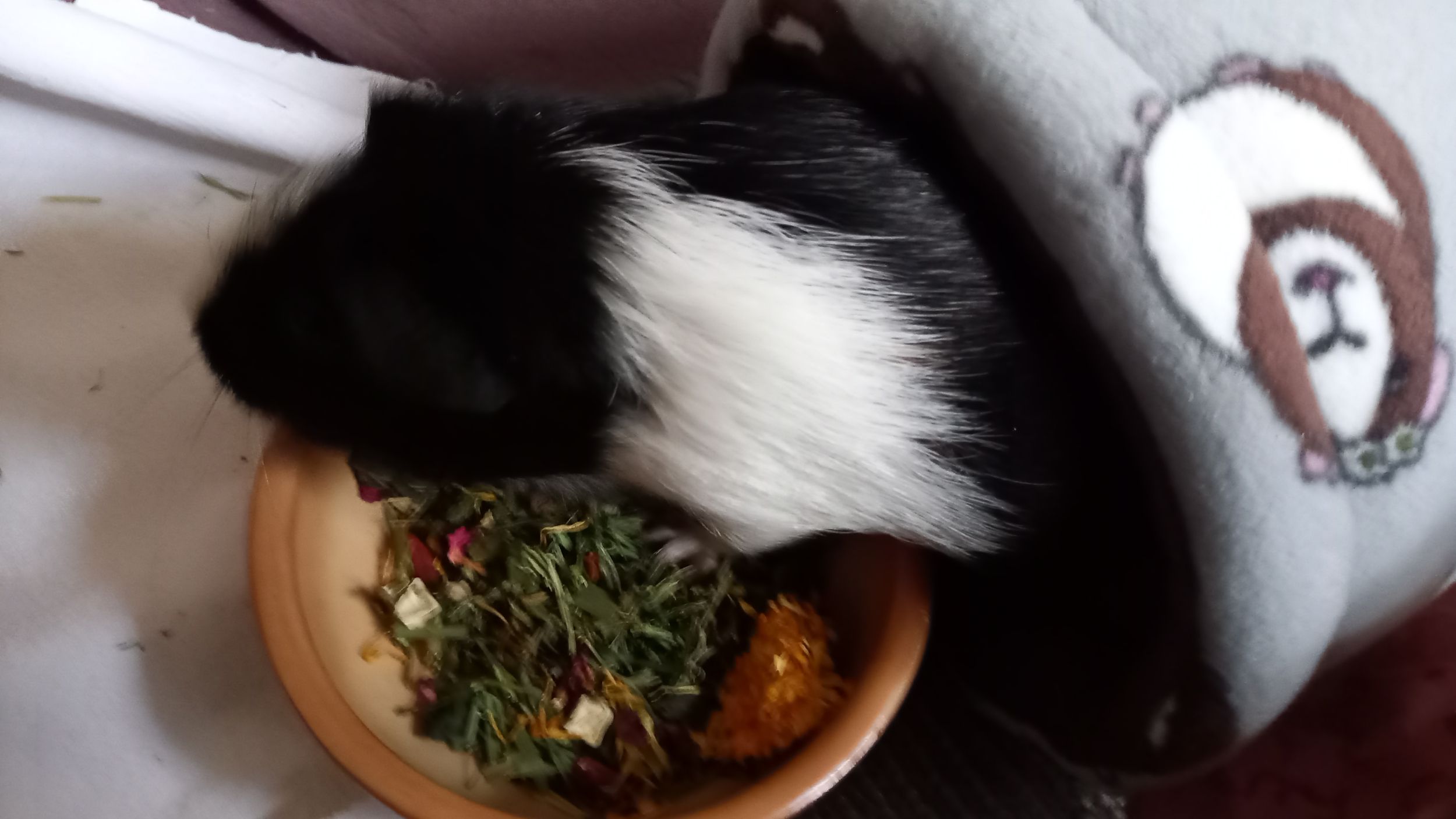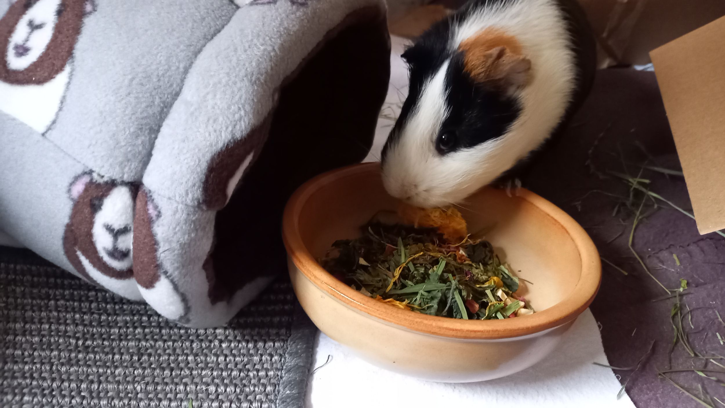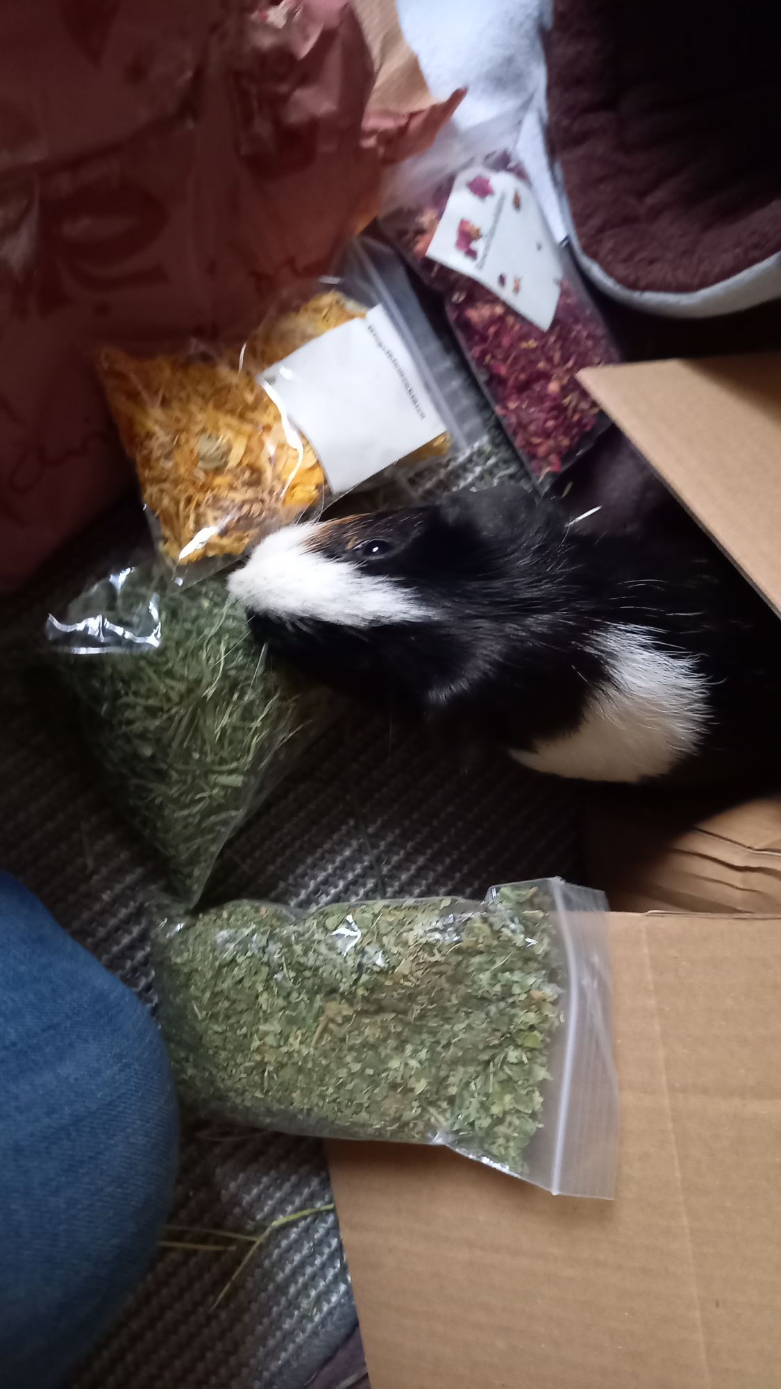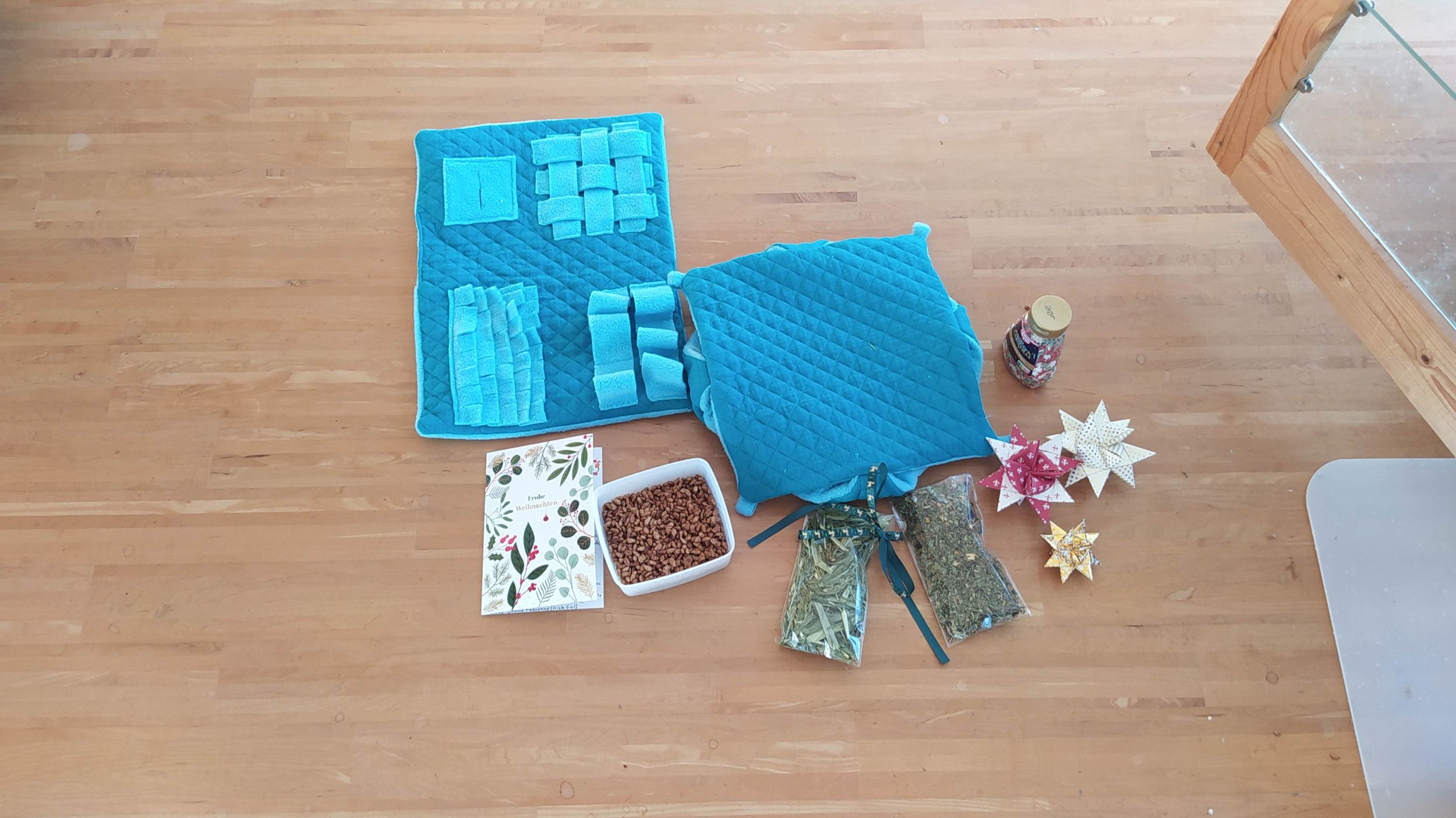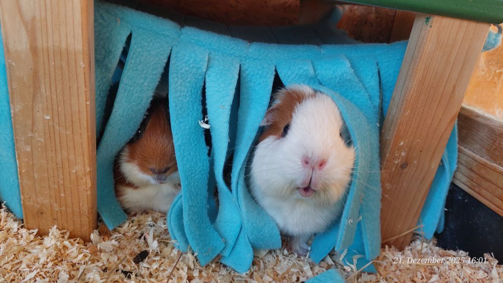 Hier einige Impressionen unserer Meerschweinchen-Wichtelbescherung. Hanni, Nanni und Simba waren begeistert von den kulinarischen Genüssen, dem leckeren Heu und vor allem vom neuen Kuschelsack. Sie sind gleich hindurchgelaufen. Sonst brauchen sie immer länger, bis sie sich in ein neues Kuschelobjekt trauen. Wir Menschen hier freuen uns auch sehr über den Inhalt des Pakets!!! soooo lieb alles ausgesucht und verpackt!!!!