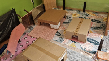 Ihnen steht ein Gehege von ca 5qm zur Verfügung. Es gibt viele Futterstellen und Papphäuschen mit mindestens einem Eingang pro Seite, meist zwei oder ein breiter.