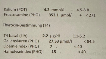 • Da ist der T4-Wert mit dabei und im Normalbereich. Wenn man 100% sicher sein möchte, könnte man noch fT4 bestimmen lassen, das wird laut einer Quelle eher genutzt um eine Hyperthyreose festzustellen, aber eigentlich ist das schon recht aussagekräftig mit dem T4-Wert.