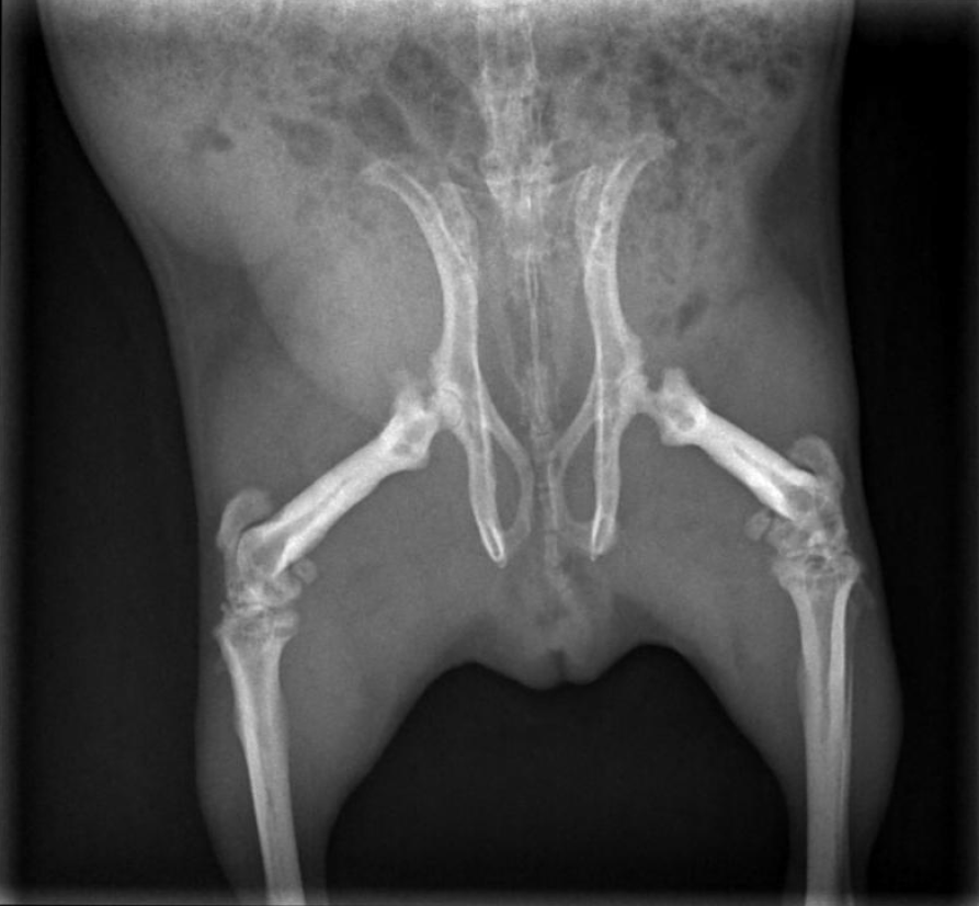 Im Juli ist mir aufgefallen, dass die 1 jährige Lucy ihr linkes Hinterbein überhaupt nicht mehr belastet. Als ich sie geholt habe, habe ich - unwissend - über ihr glänzendes Fell gestaunt. Viel glänzender als das der anderen. Beim Tierarzt (Sachkunde Heimtier) und einem Röntgen später stellte die Ärztin fest, dass ihre Hüfte quasi "weg" ist. Aufgelöst. Ganz viel Google und lesen weiter dachte ich, dass Lucy wahrscheinlich mit Satin-gen und der Diagnose Osteodystrophie zum Tode verurteilt ist.