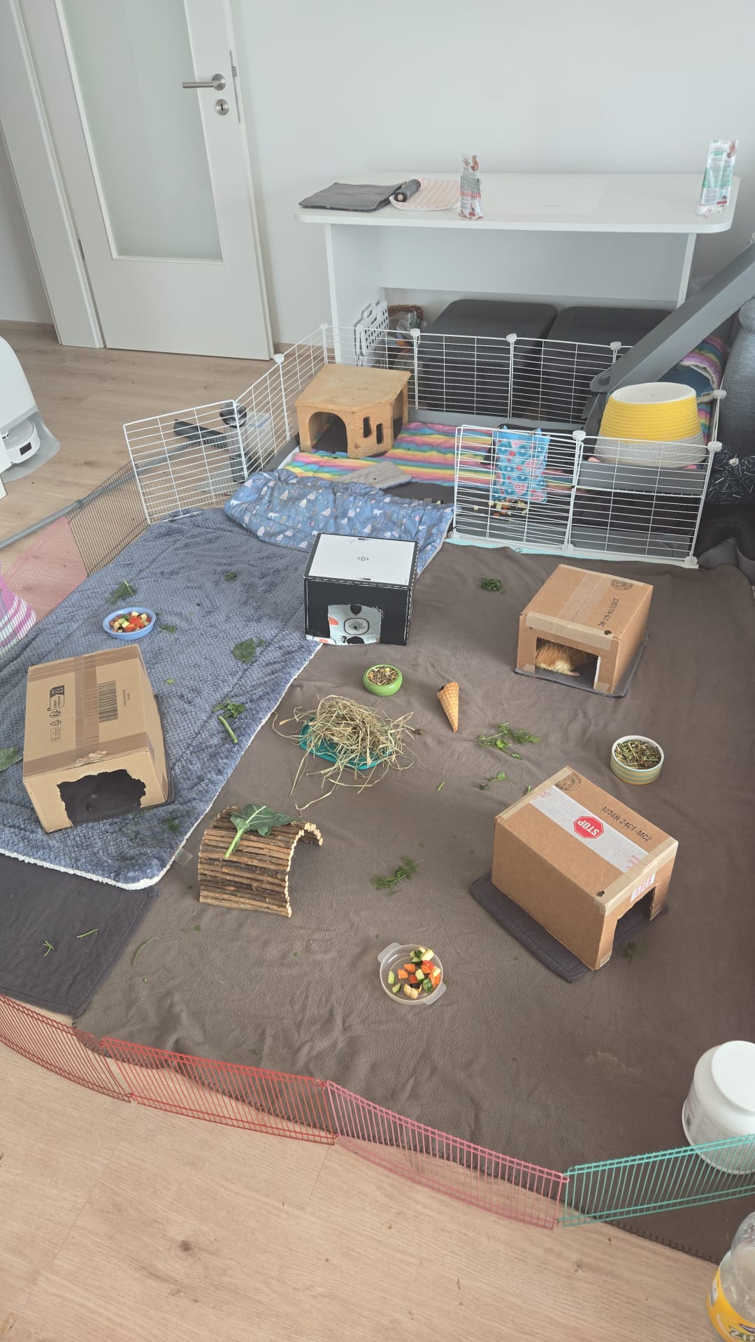 Da das Ganze jetzt seit Sonntag Abend anhält sind wir ratlos. Es bricht uns das Herz, dass er scheinbar leidet und sehr sehr sehr ängstlich ist. Stressen wir ihn unnötig? Sollten wir Cake wieder abgeben (ist möglich) und ein anderes Schweinchen ausprobieren? Ist das normal, dass es solange dauert? Muss er da durch? Wir haben uns eigentlich bis heute Abend ein Limit gesetzt, an dem wir entscheiden wie wir handeln wollen. Aktuell haben wir noch diese Woche Urlaub. Miteinander „reden“ tun beide nur sehr selten. Den Bereich haben wir auch verkleinert, da er nur Ausgewichen ist bisher. Die Ebene zum Haus nach oben haben wir ebenfalls weggeklappt.