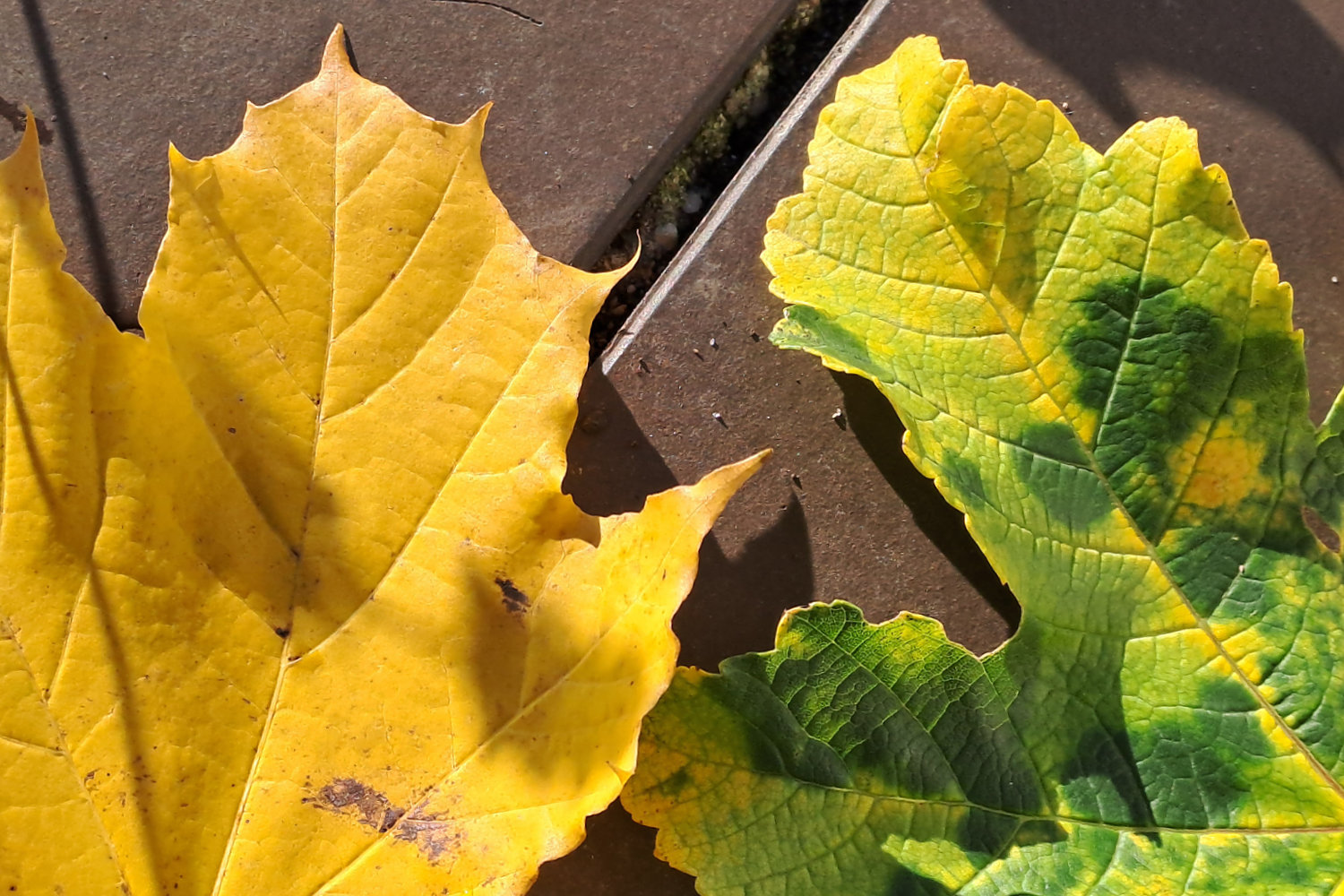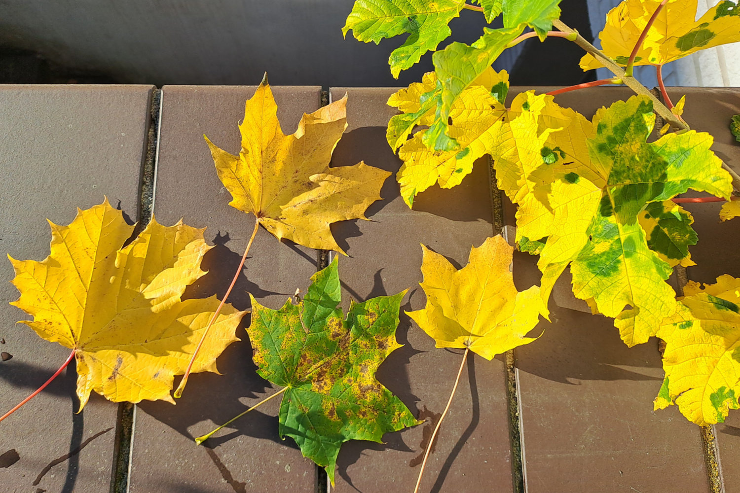 Spitzahorn: die 4 linken Blätter - Bergahorn rechts, noch am Zweig - 06.11.25