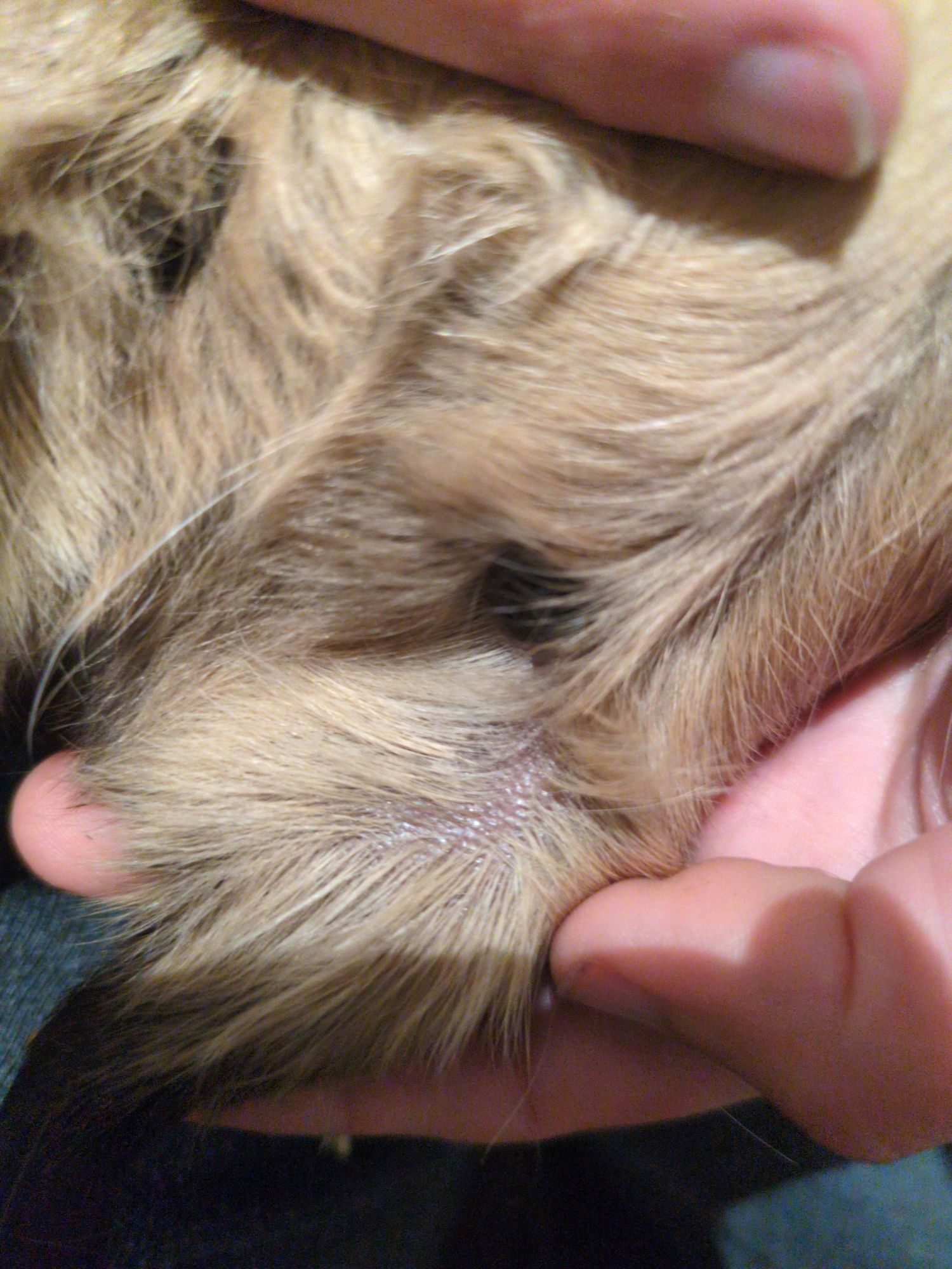 • Bei meinem Schweinchen Motte habe ich etwas entdeckt: an den Innenseiten der Hinterläufe ist beidseitig eine kahle Stelle, siehe Bild (draufklicken, um das Bild ganz zu sehen).