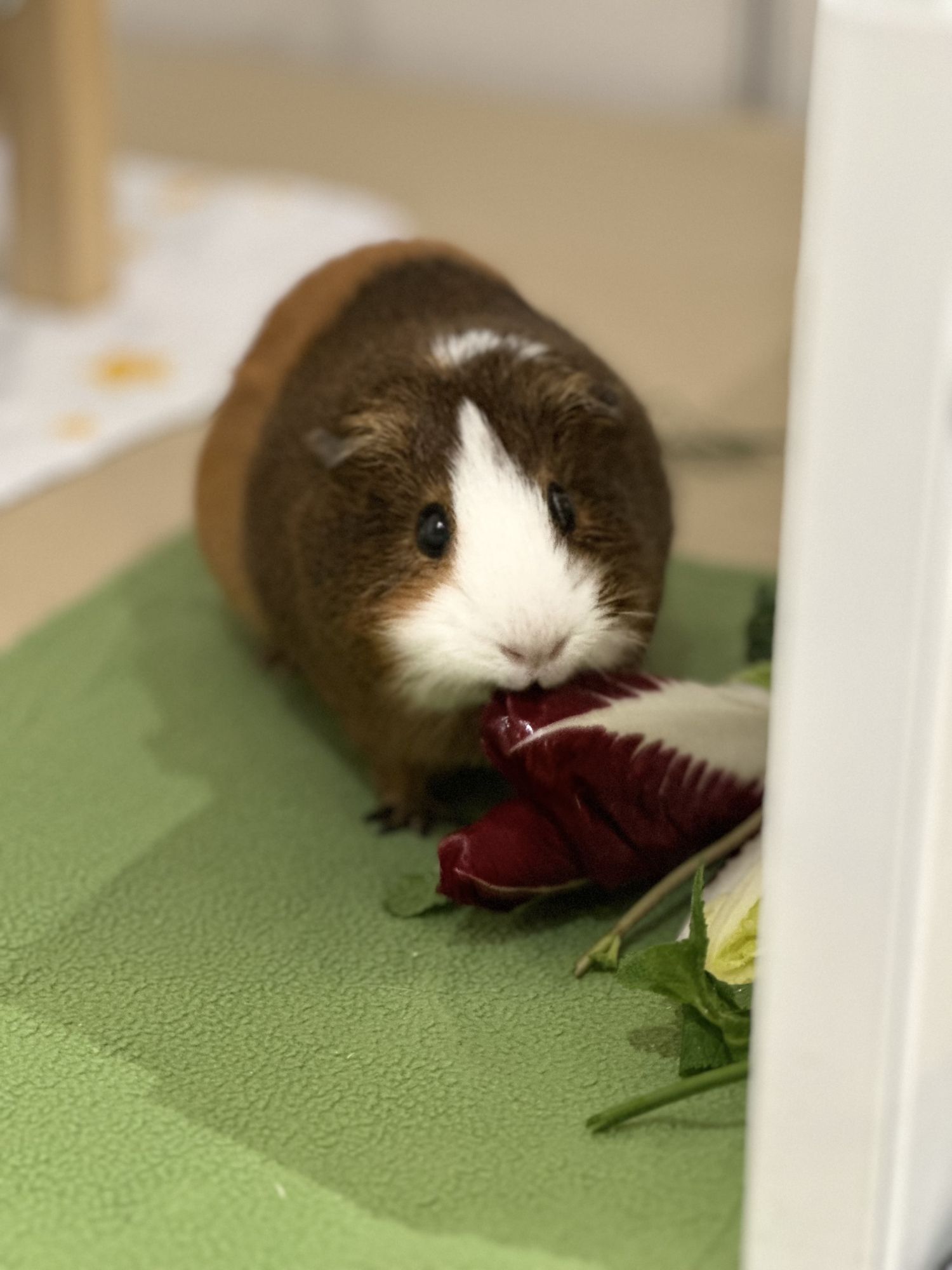 Man kann sie auch immer wieder beobachten, wie sie zum Salat oder zum Heu geht und sich dort etwas nimmt. Es ist nicht die Menge, aber dies tut sie regelmäßig über den Tag.