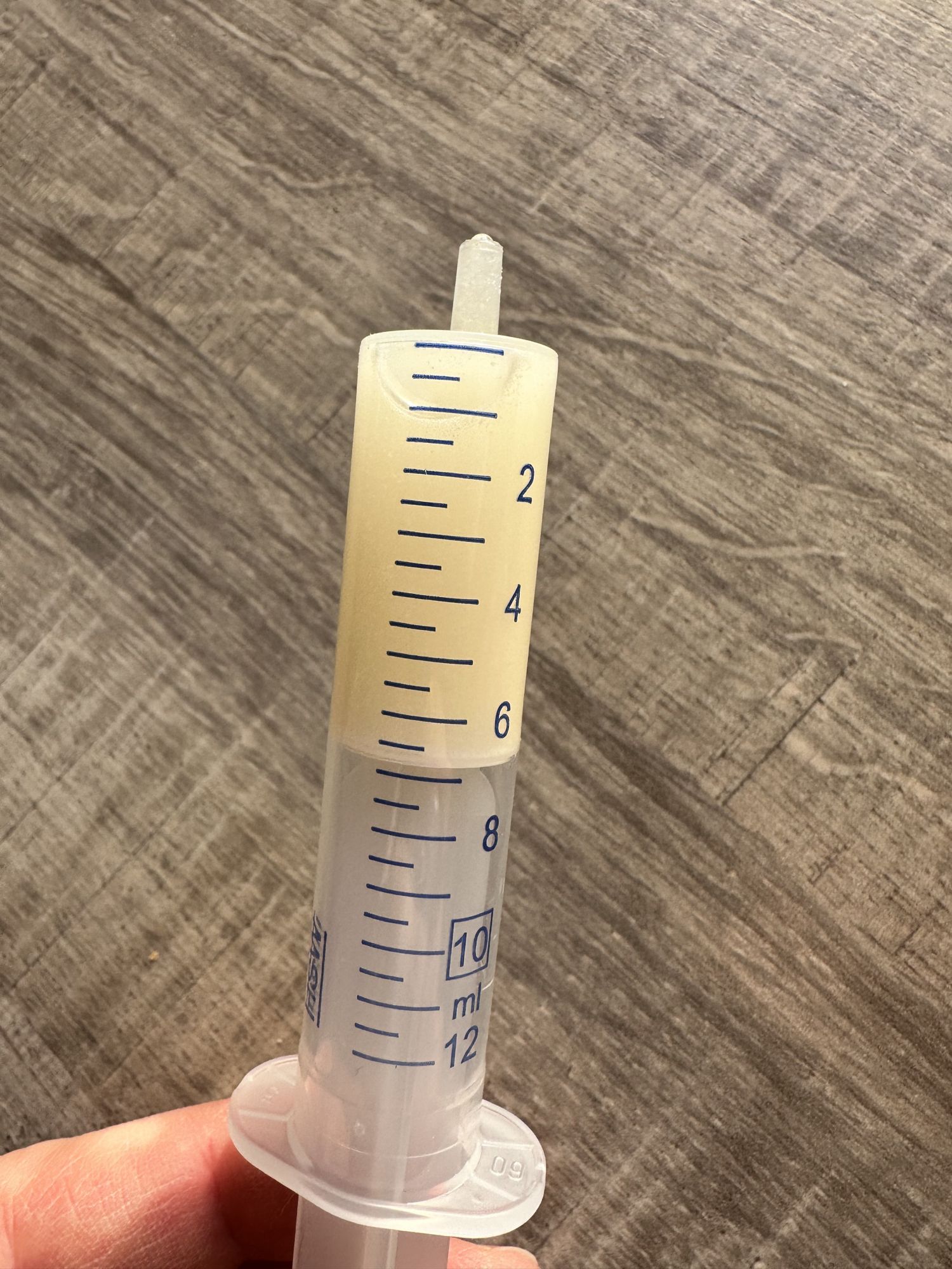 Dann habe ich nach und nach Wasser aufgefüllt, insgesamt waren es 7 ml. Und das Ganze beim auflösen mit einem Holzstäbchen hin und wieder umgerührt. Vielleicht hätte ich auch noch mehr Wasser rein füllen können, damit das Ganze dünner wird. Aber Ella ist nicht immer die geduldigste, wenn es etwas oral einzugeben gibt. Wenn ich gemerkt hätte, dass sie sich richtig weigert, dann hätte ich es aber noch weiter verdünnt.