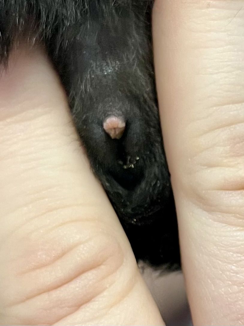 Ich habe heute nochmal ein schärferes Foto gemacht. Sieht es nach einem Mädchen aus? Würden sie gerne behalten in der Gruppe mit dem kastrierten Papa und der Mama, sollte das kleine Wesen ein Mädchen sein.