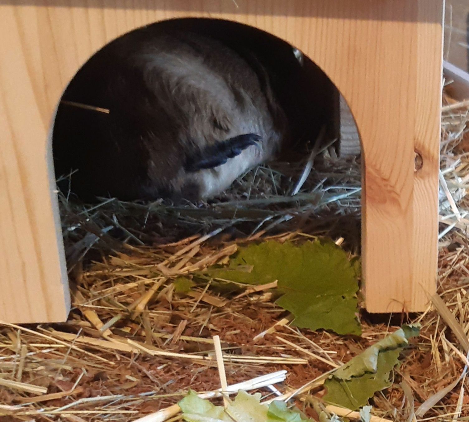 Motte war ein zierliches Satin-Meerschweinchen. Sie wurde ca. Februar 2022 geboren und lebte bis April 2026. Als ich sie bekam, war sie 1,5 Jahre alt. Sie wurde mir von einer Notstation vermittelt, mit der Aussage, ich solle sie wegen des Satin-Fells auf OD röntgen lassen, sie würde aber bislang noch keine Symptome zeigen. Bei mir angekommen war recht schnell klar, symptomfrei ist anders. (Kein Vorwurf an die Notstation, es ist eine kleine Notstation, die nicht wie ich jedes Schweinchen stundenlang beobachten kann, und ich war vorgewarnt.) Auffällig war eine merkwürdig verkippte Haltung beim Liegen. Ich habe davon leider nur ein schlechtes Bild, aber stellt euch vor, die Hüfte ist im Liegen um bis zu 90° gekippt, sodass ein Fuß deutlich in die Luft hängt. Aber der Körper ist dabei ganz gerade und nicht "crossaintförmig" abgelegt.